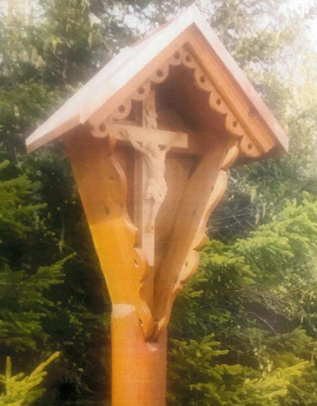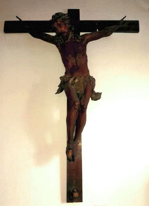 Gerade gehobelte Kreuzbalken mit zweizeiligem Titulus. Christus im Drei-Nagel-Typus, das Haupt auf der rechten Schulter aufliegend. Stark in Falten gelegtes Lendentuch, die Enden auf der Körperseite herabfallend.