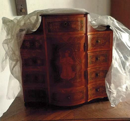 Dreiteiliges Möbel konvex-konkav geschwungen auf rund gedrechselten Füßen. Beide Seitenteile mit jeweils vier Schubladen, oben mit einem konkav geschwungenen Zierteil abgeschlossen. Runde Halteknöpfe. Der Mittelteil vorkragend mit einer Schublade unten bzw. oben (diese sperrbar), gerader Abschluss. In der Höhe über drei Schubladen reichende Tür, über Bänder nach rechts aufklappbar. In der Mitte die figürliche Darstellung eines jugendlichen Heiligen in Frontalansicht (Christus?, mit emporgestreckten Kreuz in der rechten Hand und Stab/Szepter in der linken).