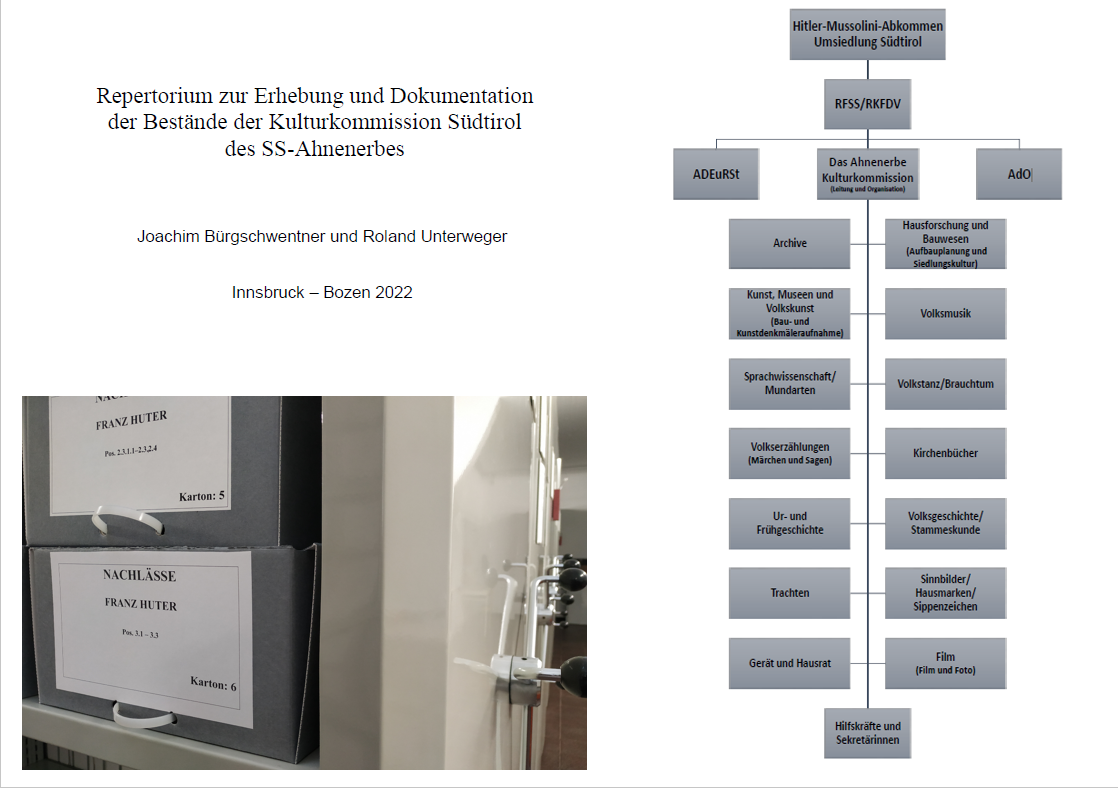 Das Findbuch zu verstreuten Beständen der „Kulturkommission Südtirol“ wurde am 2. Februar 2023 in Bozen vorgestellt. Das im Rahmen des Förderschwerpunkts „Erinnerungskultur“ des Amts der Tiroler Landesregierung und der Autonomen Provinz Bozen, koordiniert vom Tiroler und vom Südtiroler Landesarchiv, in den Jahren 2017–2019 erarbeitete Spezialfindbuch zu den Unterlagen der vor allem zwischen 1940 und dem Kriegsende im Mai 1945 aktiven „Kulturkommission Südtirol“ ist ab 2. Februar 2023 auf den Webseiten der beiden Archive online gestellt.