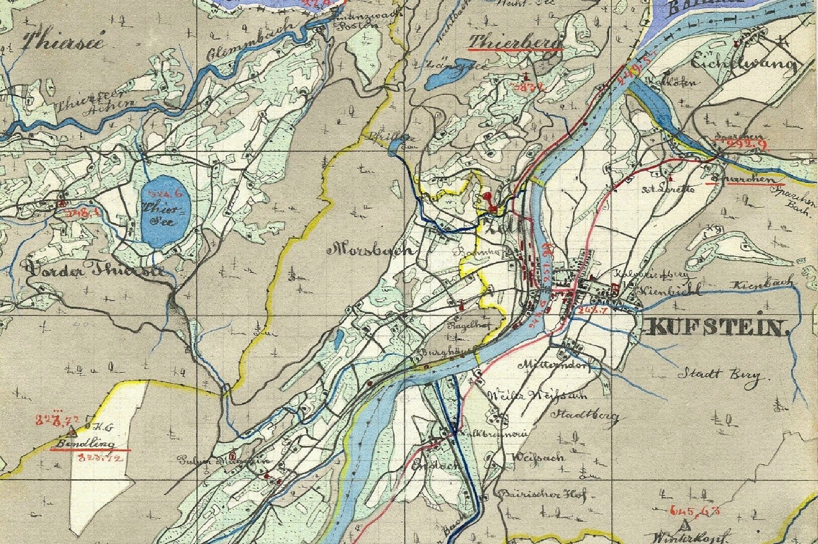 Diese Karte, hier bildlich am Beispiel Kufstein vorgestellt, ist eine kartographische Rarität. Wahrscheinlich existiert von ihr, der sogenannten Kulturen-Skelett-Karte nur ein von Hand gezeichnetes Exemplar: Tirol und Vorarlberg mit Stand um 1861 im Maßstab 1 : 36.000.
