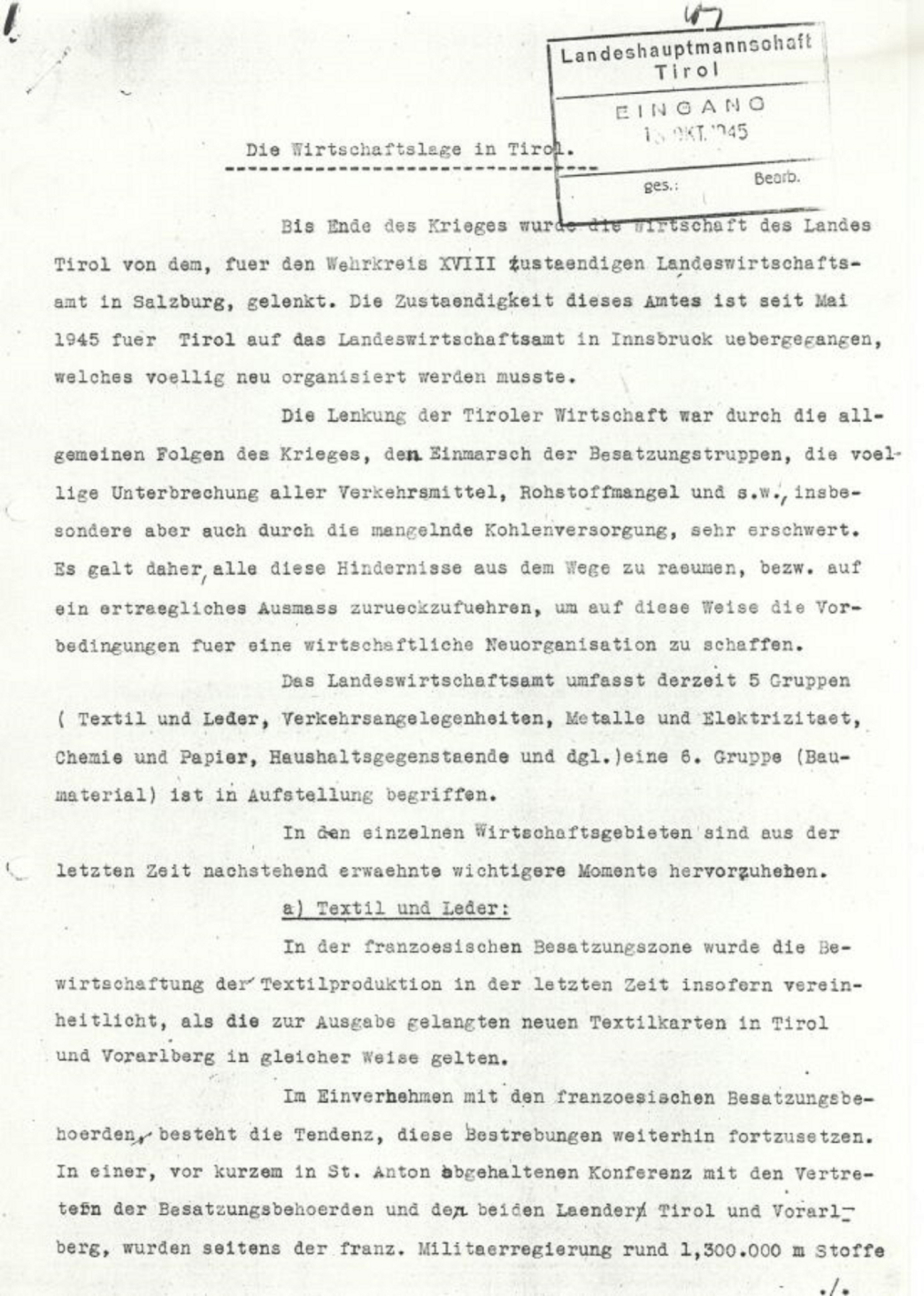 Wie stand es im Jahre 1945, wenige Monate nach Kriegsende, mit der Wirtschaft in Tirol? Kriegsschäden waren zu beseitigen. Das Land war überschwemmt mit Menschen. Es fehlte an allem: Energie, Rohstoffen, Halbfabrikaten, Gerätschaften und vor allem an Lebensmitteln. Wie man sich damals behalf, unter diesen widrigen Umständen wirtschaftlich wieder Fuß zu fassen, darüber gibt ein amtlicher Bericht vom Oktober 1945 Auskunft.