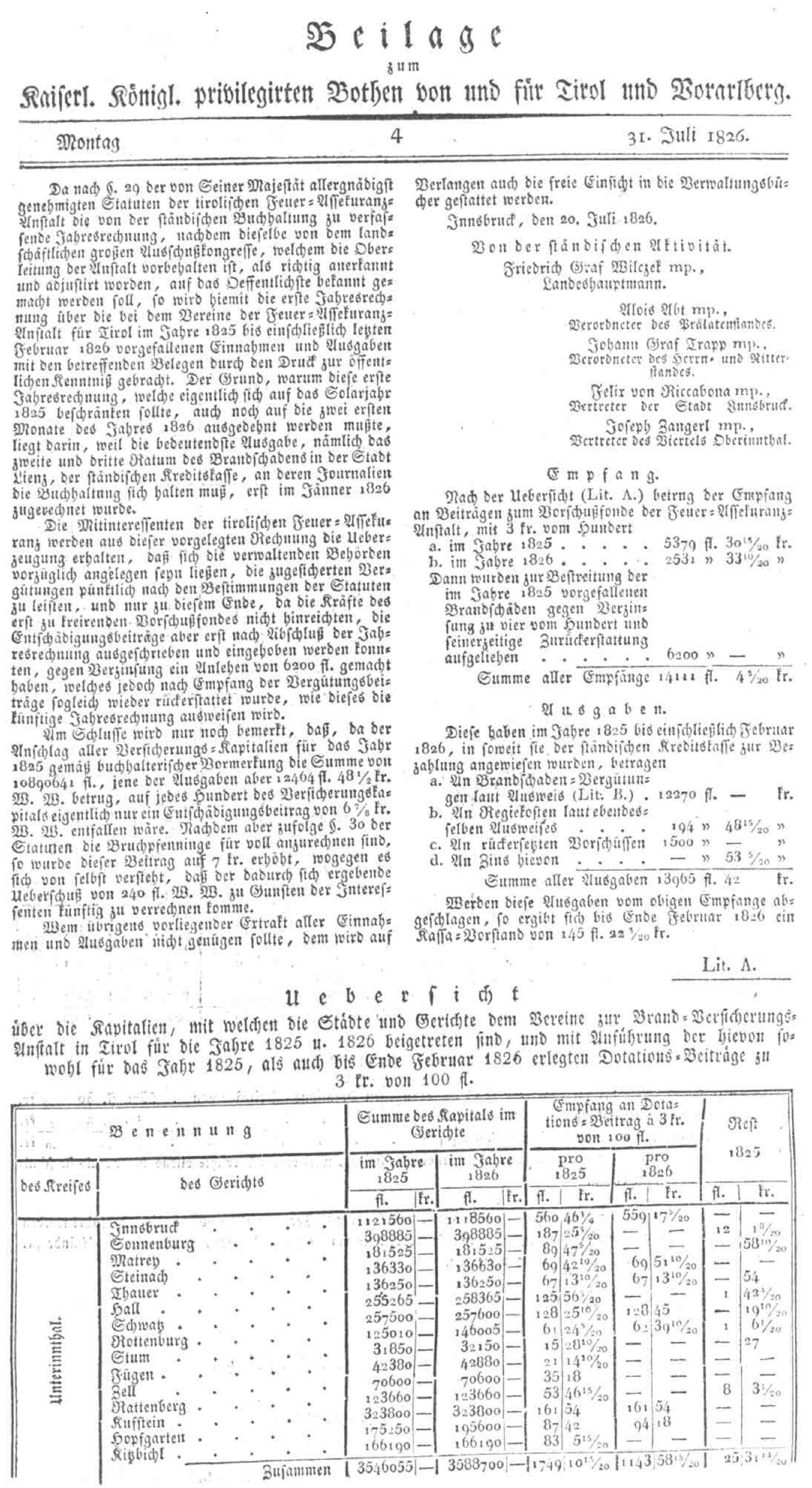 Einfach war es nicht. Nur mühsam konnten die Tiroler davon überzeugt werden, sich gegen gewisse Risken zu versichern. 1825 nahm die erste Versicherungsanstalt auf Tiroler Boden ihre Geschäftstätigkeit auf; Feuer war das Risiko, das sie abzudecken suchte. Damit zählt in Österreich unser Land zu den Pionieren auf dem Gebiet des Versicherungswesen.