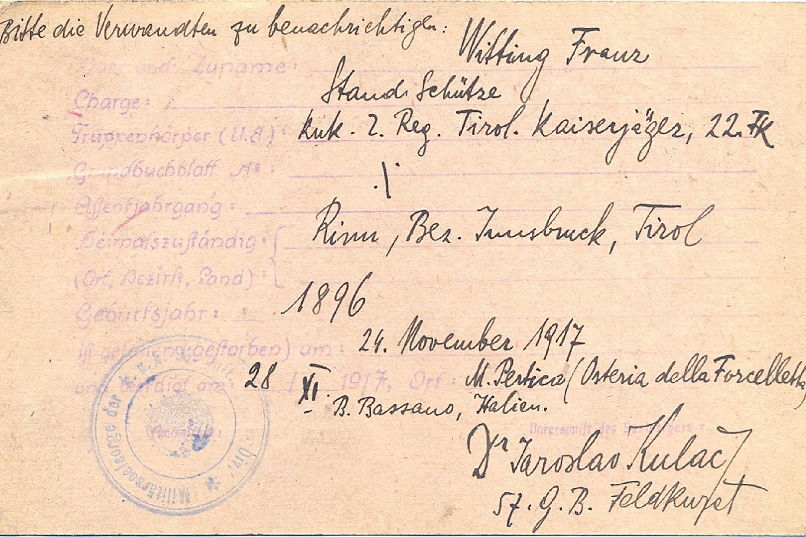 Eine Todesnachricht auf einer Feldpostkarte mit Vordruck, abgeschickt vom Feldkuraten der k. u. k. 57 Gebirgsbrigade an das Pfarramt Rinn bei Innsbruck mit der Bitte, die nächsten Angehörigen zu verständigen: Franz Witting aus Rinn, geb. 1896, Standschütze im 2. Regiment der Tiroler Kaiserjäger war am 24. November 1917 am Monte Pertica gefallen. Wahrlich kein Einzelschicksal im Ersten Weltkrieg, Tausenden von Tiroler Soldaten kostete er das Leben. Wie viele Gefallene (Kriegs- oder militärische Tote) zählte das Kronland Tirol? Wie viele Soldaten aus Tirol hatten in diesen Krieg zu ziehen?