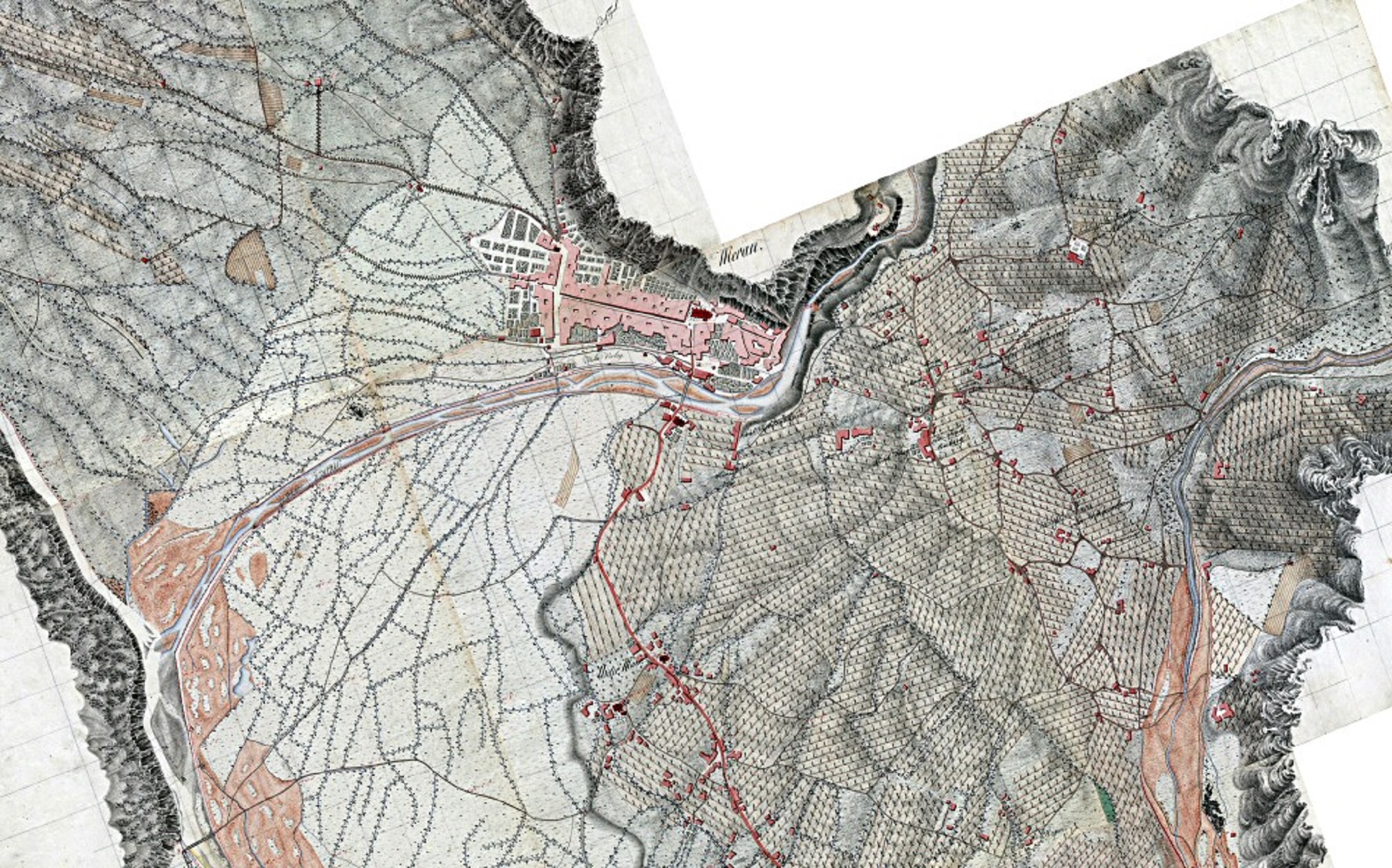 Über weite Strecken ist die Etsch ein Gebirgsfluss, der nach rund 220 km die Alpen verlässt und in die Poebene sich ergießt. Mit einer Länge von 415 km ist die Etsch der zweitgrößte Fluss Italiens. Gut die Hälfte ihrer Strecke entfiel auf Alttiroler Territorium, die Grafschaft oder das österreichische Kronland Tirol. Dort begleiteten Auen, Schilfgürtel, aber auch Sümpfe den Fluss, der berüchtigt war wegen seiner ständigen Überschwemmungen. Der Landwirtschaft wurde dadurch nicht nur fruchtbares Land geraubt und vorenthalten, in den Sümpfen lauerte die Malaria und gefährdete die Menschen. Seit den späten 18. Jahrhundert gab es von staatlicher Seite Überlegungen, die Etsch von Meran abwärts systematisch zu regulieren, den Hochwasserschutz auszubauen. Diesem Umstand verdanken wir die erste Aufnahme der Etsch zwischen Meran und Besenello, die Ignaz von Nowack, Major des Genie-Korps der österreichischen Armee, zwischen 1802 und 1805 vorgenommen hat.