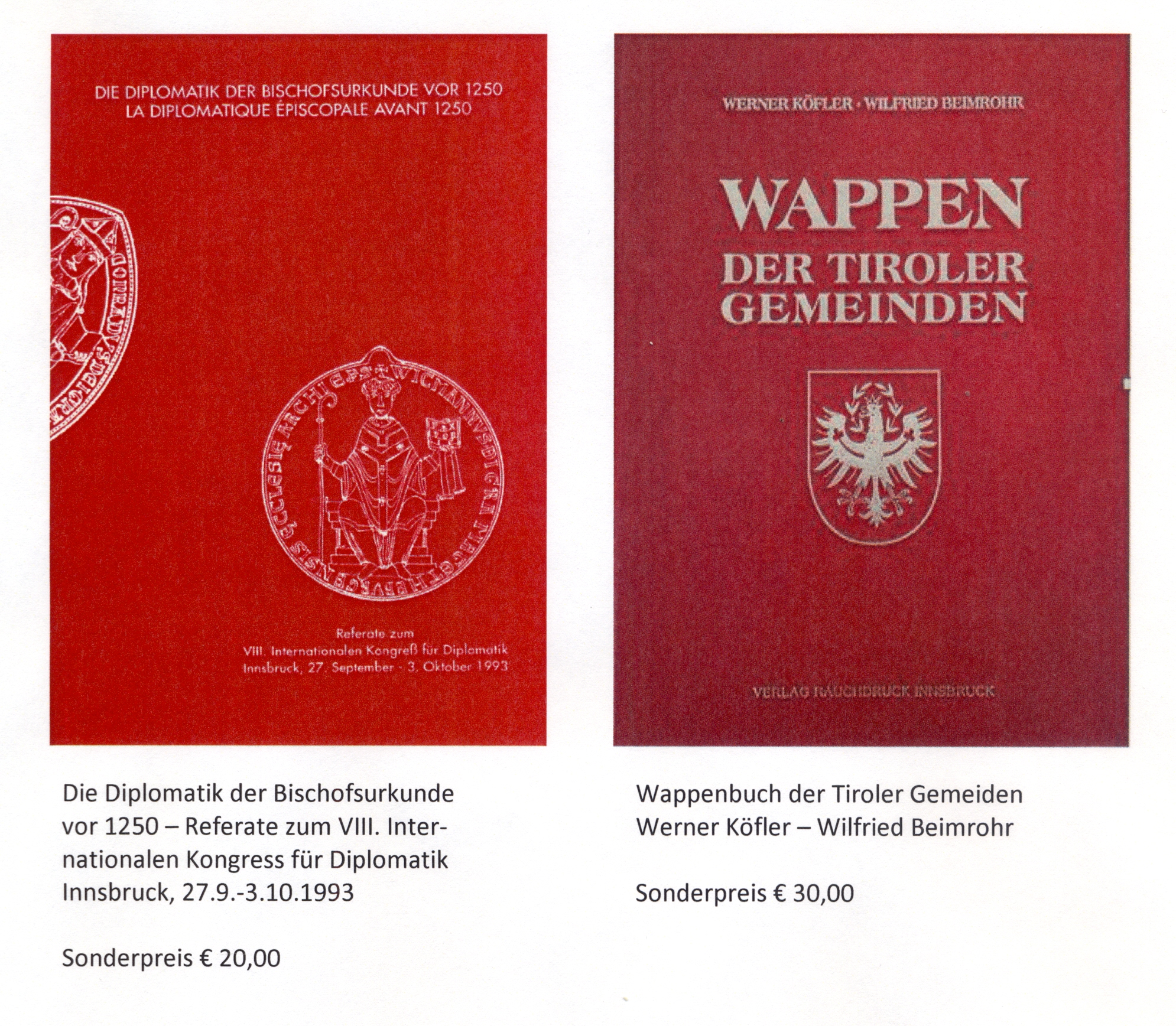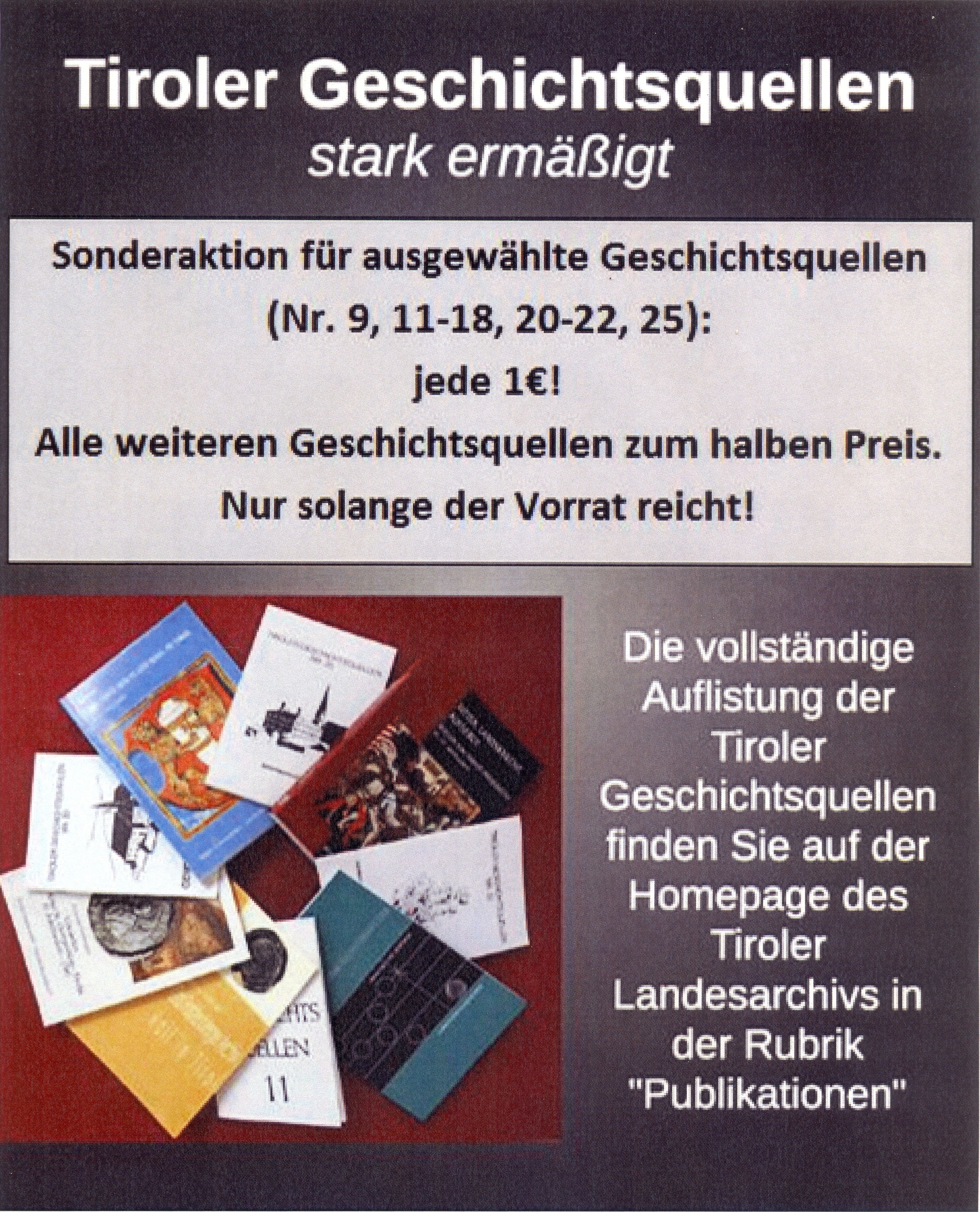 - Publikationen "Tiroler Geschichtsquellen Nr. 1 - 25" um € 1,--, alle anderen zum halben Preis