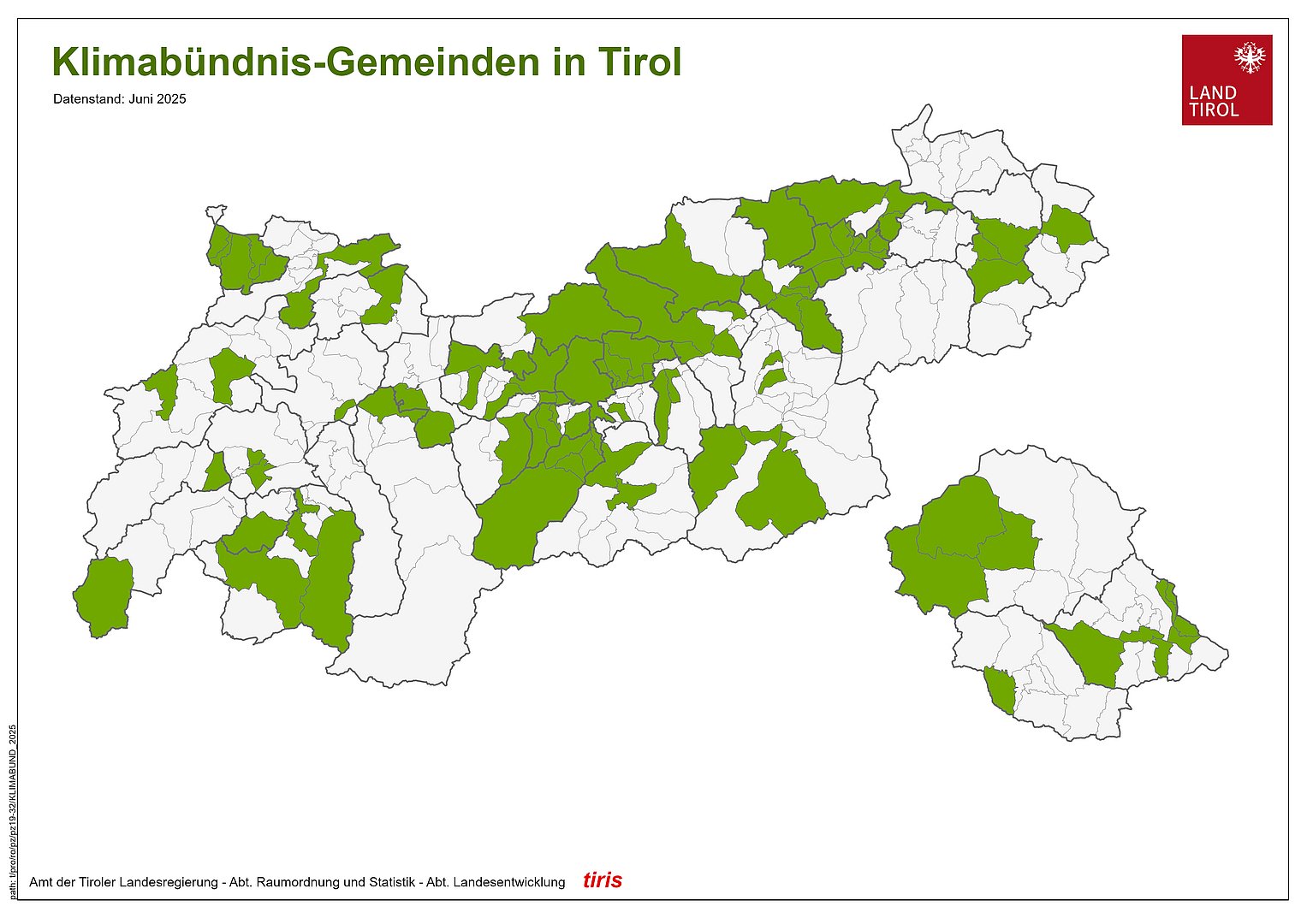 - Liste der Tiroler Gemeinden mit Anführung der Teilnahme an den klimarelevanten Programmen KEM, KLAR, Klimabündnis-Gemeinden, e5-Gemeinden und Pionierstädte, Stand 07/25