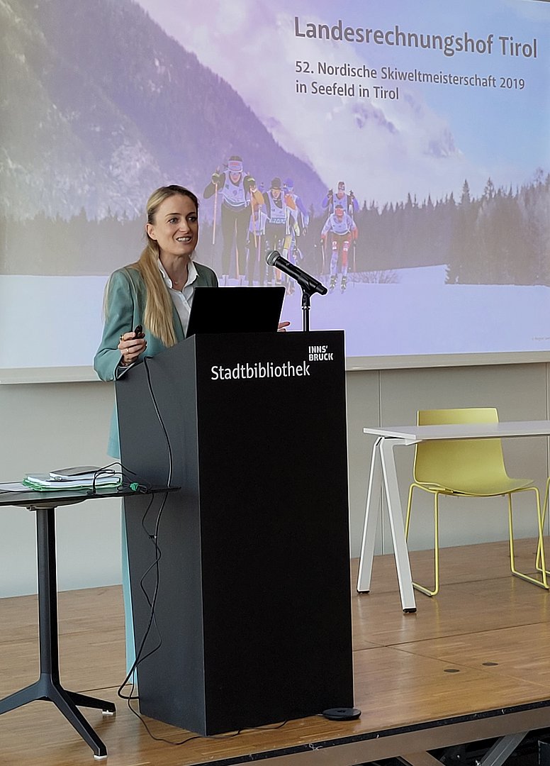 Nach einführenden Worten zum Thema der Tagung durch den Gastgeber Hans Fankhauser, Direktor des Stadtrechnungshofes Innsbruck, machte den inhaltlichen Auftakt Monika Aichholzer-Wurzer, Direktorin des Landesrechnungshofes Tirol. Mit ihrem Vortrag gab sie einen detaillierten Einblick in die Feststellungen des Landesrechnungshofes Tirol zur „52. Nordischen Skiweltmeisterschaften in Seefeld“, welche im Rahmen der Prüfungen „Gemeinde Seefeld in Tirol und ihre Beteiligungsunternehmen“ sowie „ausgewählte Bereiche der Sportförderungen des Landes Tirol“ ermittelt wurden.
