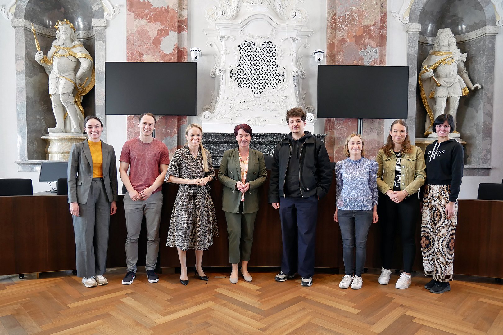 Die Exkursion startete im Sitzungssaal des Tiroler Landtages, wo die Studierenden über die Arbeitsweisen des Tiroler Landtages und den Ablauf von Plenarsitzungen informiert wurden.