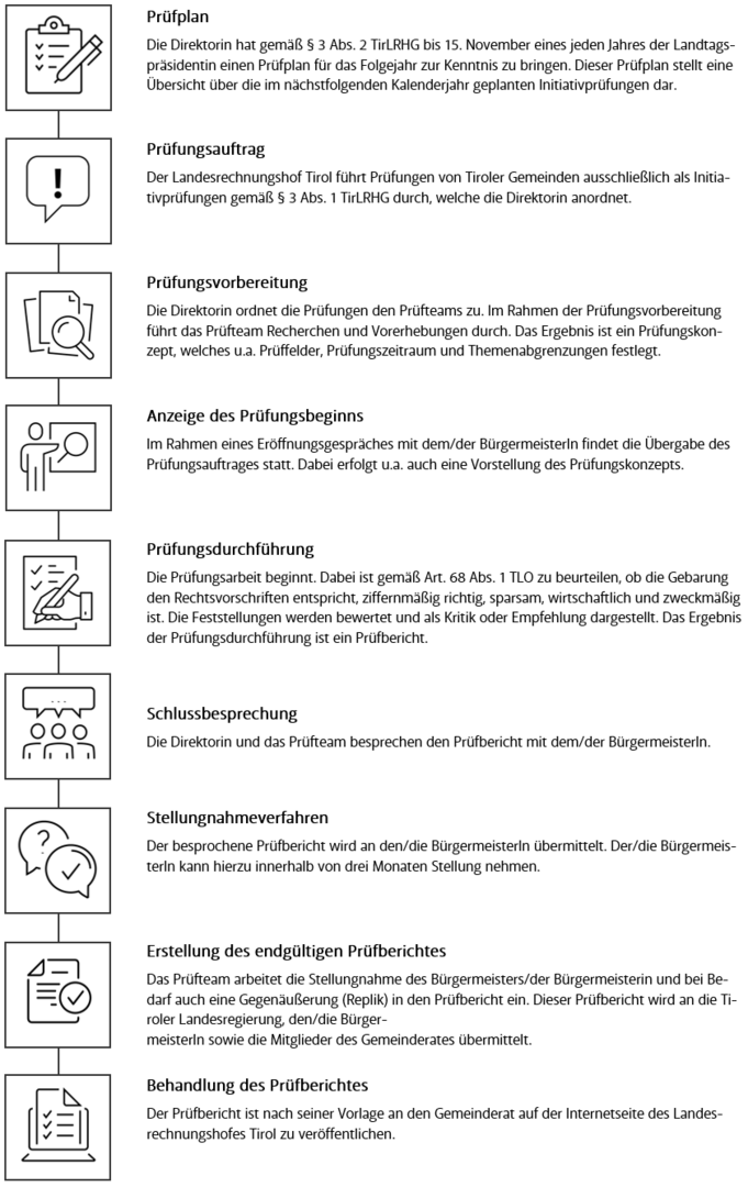 Die Prüfungsarbeit des Landesrechnungshofes Tirol basiert auf einem standardisierten Prüfungsprozess unter Berücksichtigung der gesetzlichen Vorgaben und internationaler Prüfungsstandards. Dieser Prüfungsprozess soll eine qualitätsvolle, unabhängige und effiziente Prüfungsarbeit gewährleisten. Die folgende Grafik stellt die zentralen Meilensteine des Prüfungsprozesses dar.