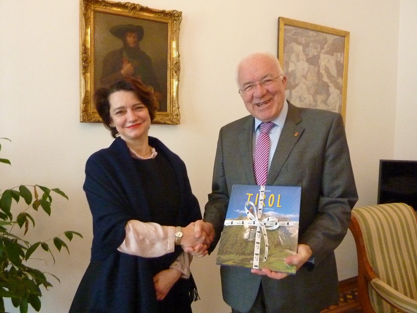 Die vor kurzem neu akkreditierte slowenische Botschafterin in Österreich Ksenija Skrilec fand sich heute zu einem Gesprächsaustausch bei Landtagspräsident Herwig van Staa im Innsbrucker Landhaus ein. Bei ihrem ersten Besuch im Bundesland Tirol wurde sie von Botschaftsrätin Petra Drausbaher Krusic begleitet.