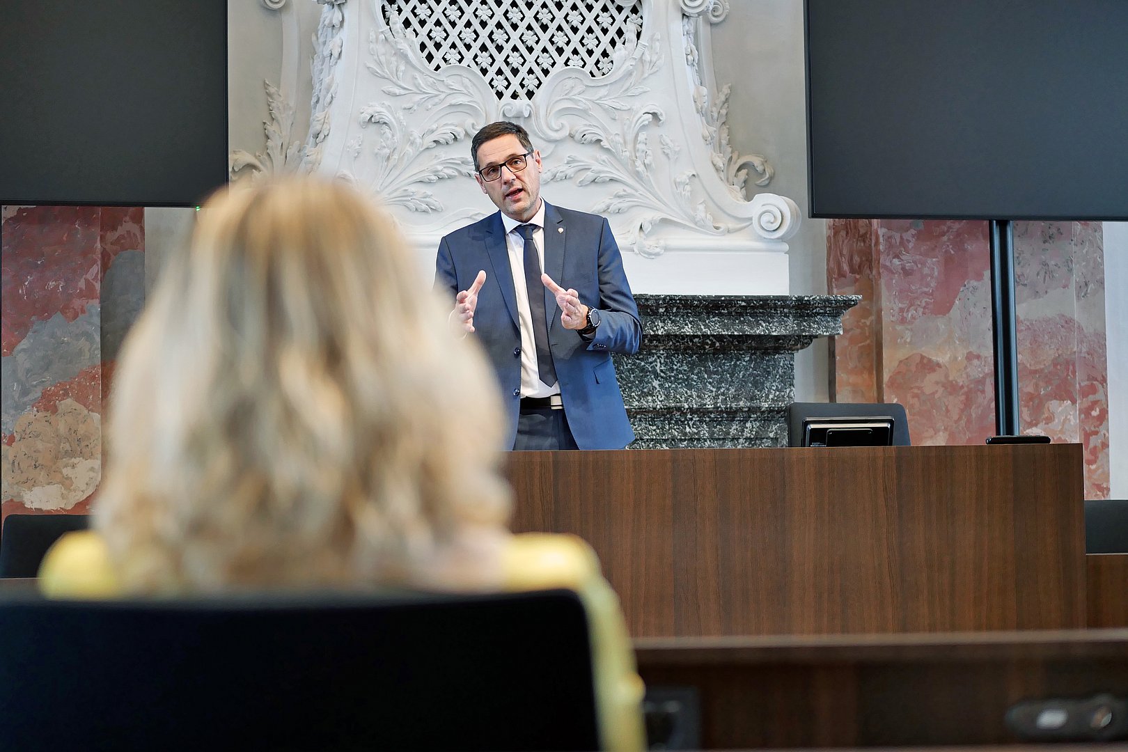 Unter dem Motto "Starke Regionen. Starke Republik" empfingen Bundesratspräsident Peter Raggl und die Präsidentin des Tiroler Landtages, Sonja Ledl-Rossmann, VertreterInnen aller politischen Fraktionen aus dem österreichischen Bundesrat und dem Tiroler Landtag im barocken Sitzungssaal. Im politischen Austausch mit den MandatarInnen referierten die Regierungsmitglieder LHStv.inIngrid Felipe, LR Johannes Tratter und LRinAnnette Leja zu aktuellen politischen Themen aus den Bereichen Umwelt- und Klimaschutz, Verkehr, Raumordnung und Gesundheit.