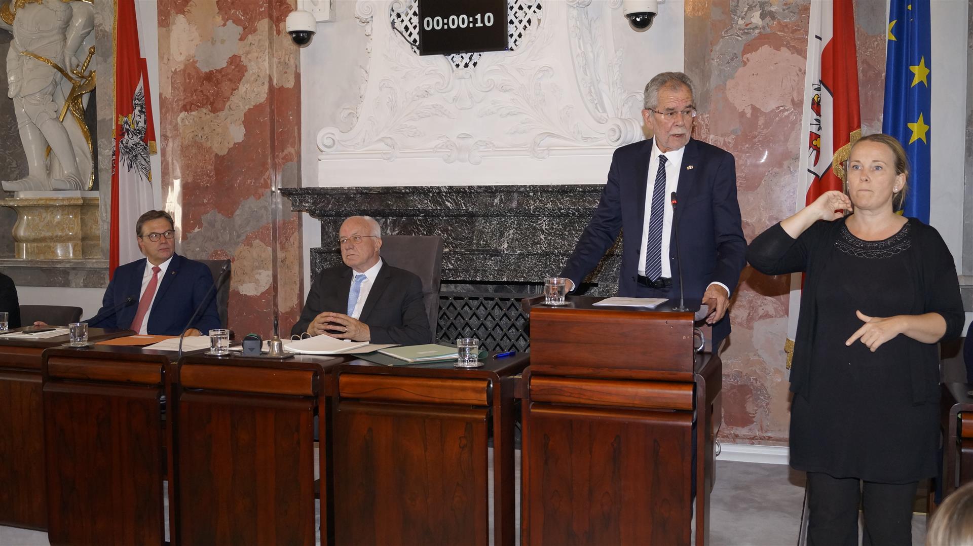 „Ich fühle mich als Tiroler und deshalb ist es mir eine besondere Freude und Ehre, heute hier vor Ihnen sprechen zu können. Das Kaunertal, in dem ich ja meine Jugend verbracht habe, ist für mich ein Symbol für die Entwicklung des ganzen Landes. Die großen Veränderungen der letzten Jahrzehnte, vor allem im hinteren Tal mit dem Stausee und dem Skitourismus, stehen sinnbildlich auch für die großen Veränderungen im Bundesland Tirol“, so Bundespräsident Van der Bellen, der einmal mehr betont, Tirol als seine Heimat zu betrachten. „Gerade auch der landesübliche Empfang, mit dem ich vor dem Landhaus begrüßt wurde und für den ich mich herzlich bedanke, ist ein wunderschöner Brauch. Bitte pflegen Sie ihn“.