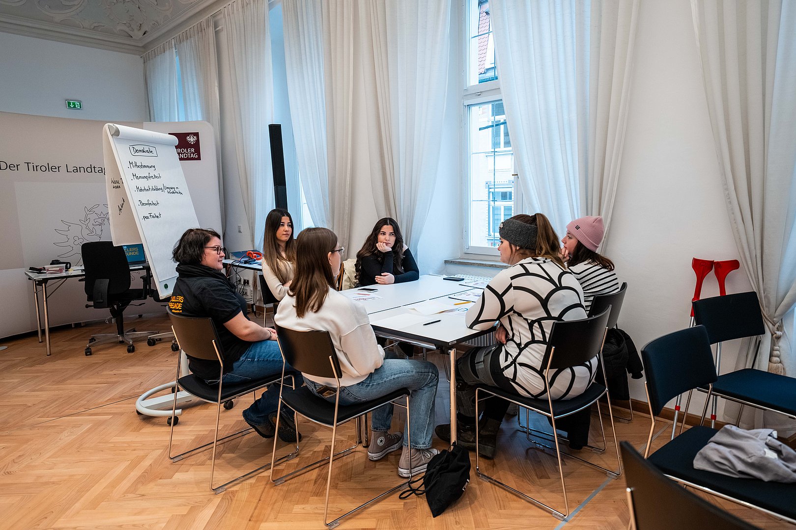 In den Workshops der „Demokratielandschaft Tirol“ bekommen junge Menschen Einblicke in die Funktionsweisen und Strukturen des politischen Systems. Das Landtagsangebot wurde nun um ein neues Format erweitert: Von Montag bis Mittwoch fand erstmals die „Lehrlingsplattform“ statt. Der dafür eigens entwickelte Workshop „Demokratie und Du“ bot über 100 Jugendlichen und Jungerwachsenen, die sich bereits in der Ausbildung oder kurz davor befinden, die Gelegenheit, sich in altersspezifisch gestalteten Modulen mit den Themen Demokratie, Mitbestimmung, Recht und Arbeit auseinanderzusetzen.