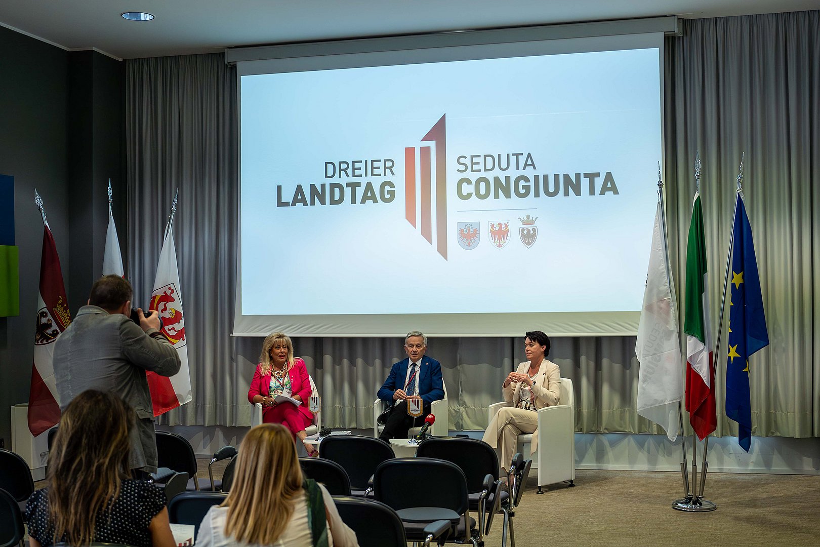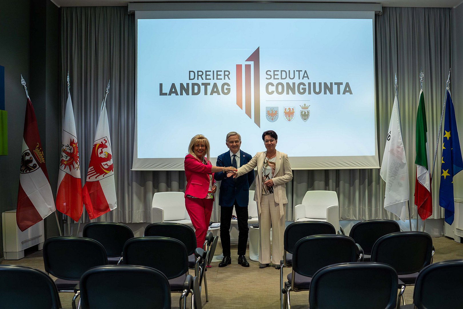 Trentinos LTP Kaswalder übergab anschließend das „Zepter“ turnusmäßig an seine Amtskollegin Mattei, der nächste Dreier-Landtag wird damit in Südtirol stattfinden.