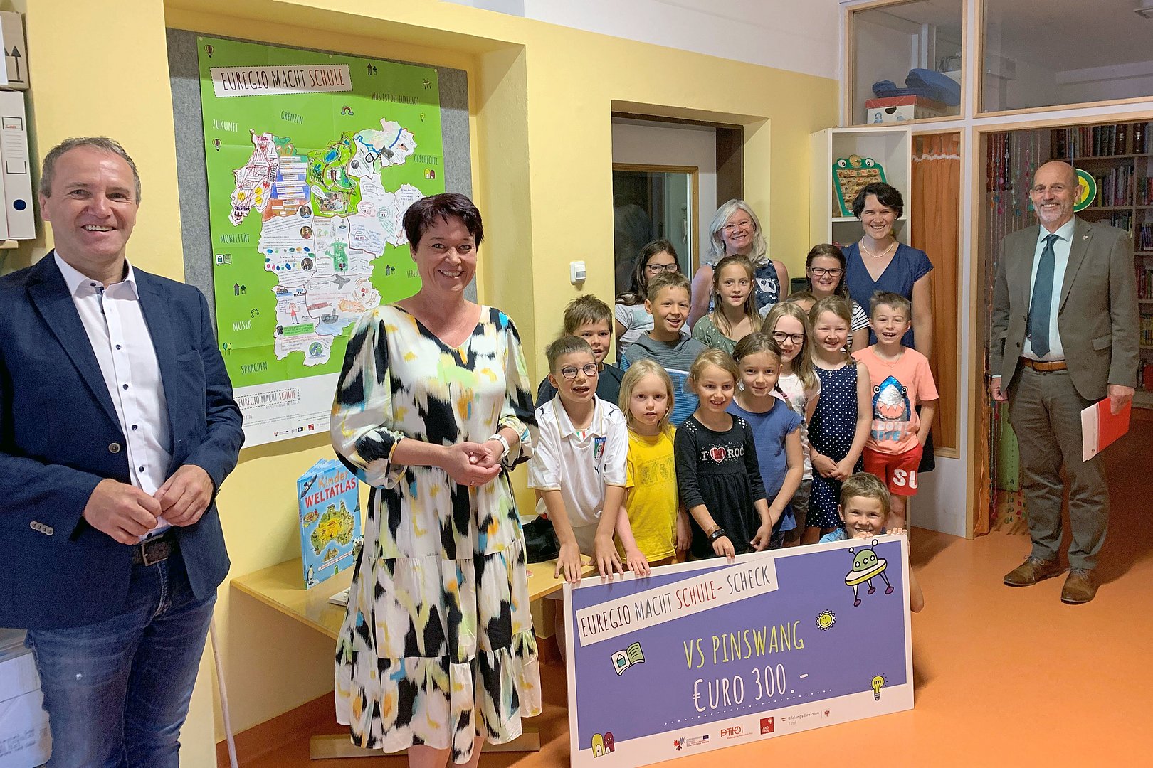 Am Wettbewerb teilgenommen haben auch die vier Schulstufen der VS Pinswang, ihr eingereichtes Plakat konnte überzeugen. Landtagspräsidentin Sonja Ledl-Rossmann überreichte den 15 GewinnerInnen in Beisein von Bgm Karl Wechselberger und Euregio-Berater Fritz Tiefenthaler einen Scheck in Höhe von 300 Euro für die Klassenkasse. „Das prämierte Plakat ist das Ergebnis einer intensiven und umfassenden Auseinandersetzung mit der Euregio. Gemeinsam mit ihren Lehrerinnen und Lehrern haben sich die Schülerinnen und Schüler Gedanken über die grenzübergreifende Zusammenarbeit gemacht und dabei auch erfahren, wie wichtig es ist, sich aktiv in Gestaltungsprozesse einzubringen“, so LTPin Ledl-Rossmann. „Ich gratuliere herzlich zu ihrem Gewinn und freue mich, dass wir durch das Projekt ‚Euregio macht Schule‘ viele neue Botschafterinnen und Botschafter unserer Europaregion gewinnen konnten.“