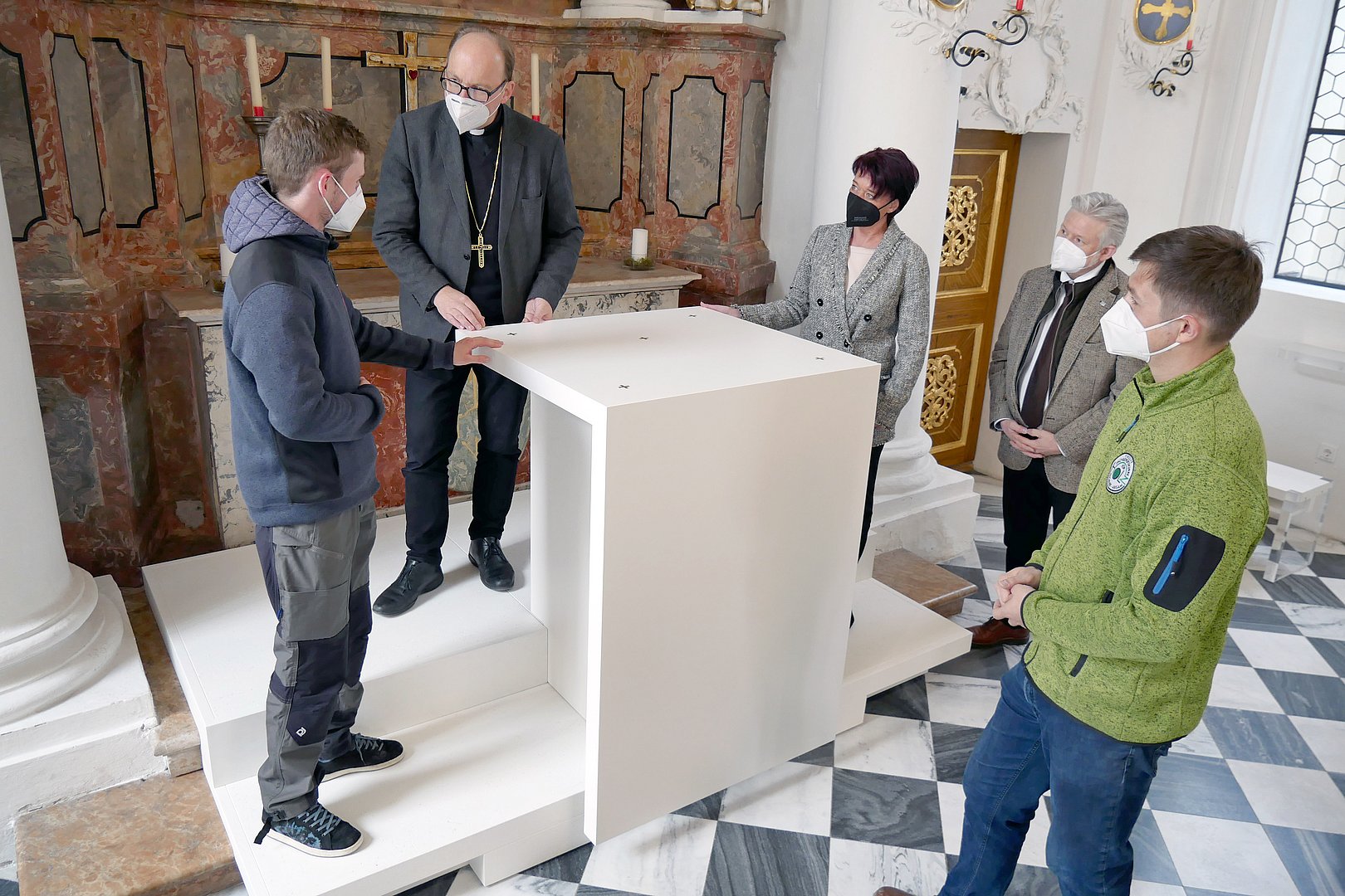 Nach 150 Planungs- und Arbeitsstunden war es soweit: Die zwölf angehenden Tischlereitechniker der Tiroler Fachberufsschule für Holztechnik Absam fügten die letzten Elemente des neuen, aus weiß lackiertem Eiche-Massivholz gefertigten Volksaltars zusammen. Sichtlich stolz erklärte Markus Wurzrainer der Abschlussklasse 4bTT anschließend Landtagspräsidentin Sonja Ledl-Rossmann und Bischof Hermann Glettler die Besonderheiten der liturgischen Holzinstallation in der Georgskapelle.
