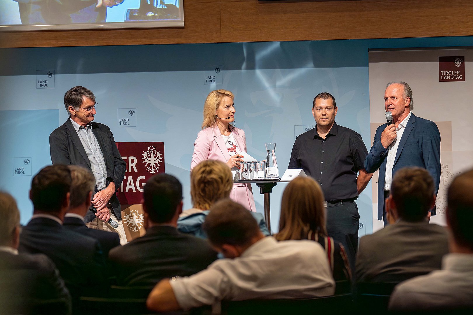 Mit Martin Sigl, Michael Krautgasser und Alfred Schneider standen anschließend drei Experten aus der Wirtschaft am Podium. Sigl, Logistikleiter bei Binderholz im Zillertal sprach von der erfolgreichen Verlagerungsumsetzung seines Unternehmens, mittels 30 eigens angeschafften Transportwaggons via Zillertalbahn Rundholz in das Inntal zu bringen und dort auf die reguläre Schiene verlagern zu lassen. Im ersten vollen Betriebsjahr dieses Projekts konnten so über 20.000 LKW von den vielbefahrenen Straßen des Zillertals genommen werden. Krautgasser war viele Jahre bei einem Holzunternehmen in Osttirol tätig und erzählte von der Kooperation mit einem Logistiker, um die „erste Meile“ zwischen seiner Firma und einem geeigneten Verladungsbahnhof zu überwinden. Schneider von Truck to Train Service GmbH betreibt in Stams einen Regionalterminal. Man fungiere als „Kümmerer“ und biete Firmen im Umkreis so die Möglichkeit, ihre Waren auf die Schienen zu bringen. Für eine flächendeckende Verfügbarkeit in Tirol wären laut Schneider mindestens fünf solche Regionalterminals im Land nötig.