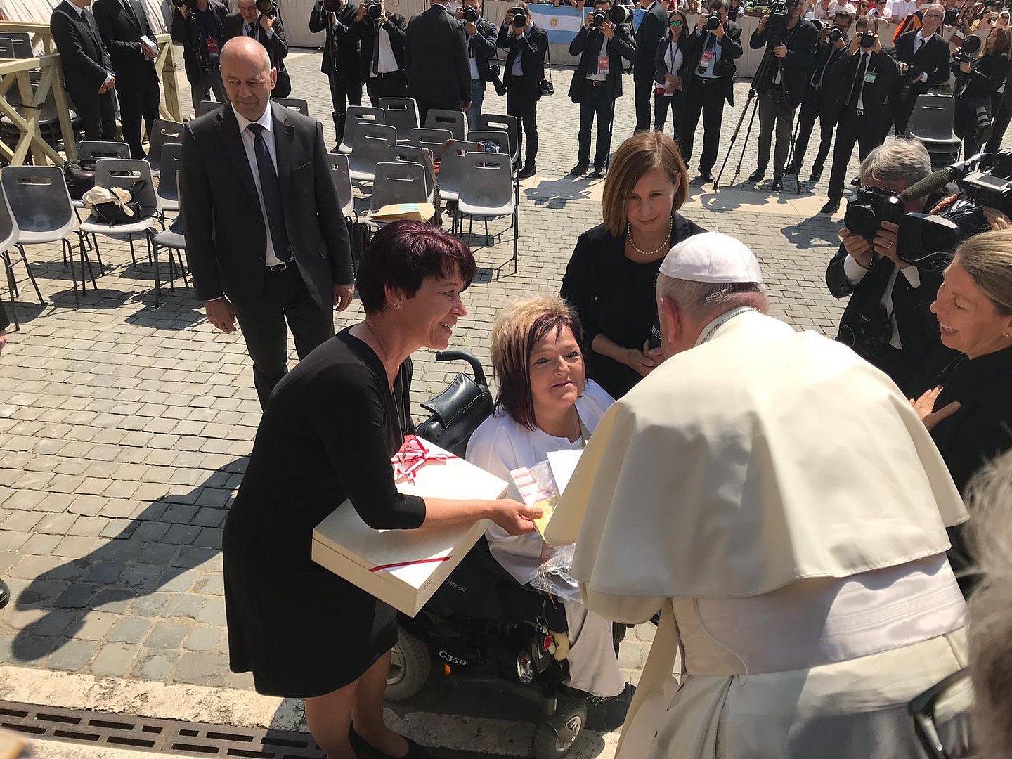 Höhepunkt des gestrigen Tages war die Generalaudienz am Petersplatz, wo es zu einem Zusammentreffen mit Papst Franziskus kam. Aus Anlass des 30-Jahr-Jubliäums des Vereins „RollOn“ wurde eine 2,3 Meter hohe Statue eines Engels mit nur einem Flügel als Symbol für das behinderte Leben von „RollOn“-Obfrau Marianne Hengl ebenfalls mit nach Rom gebracht und vom Papst gesegnet.