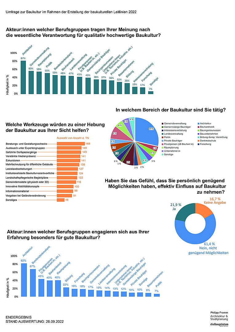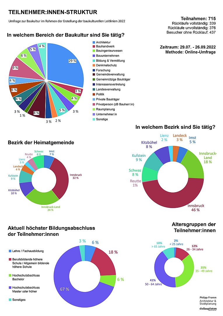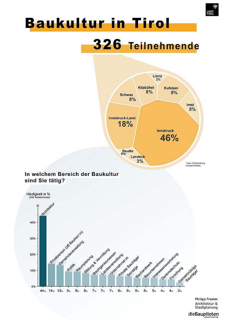 Die Online Umfrage zum Thema Baukultur in Tirol ging an ExpertInnen der Baukultur in unterschiedlichen Bereichen von Bildung, Politik, Wirtschaft über Handwerk, Architektur und vielen mehr, die Laufzeit war knapp 2 Monate von Juli bis September 2022.