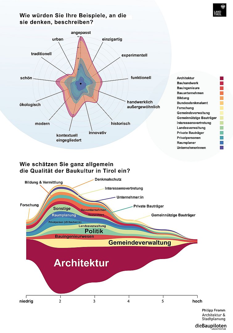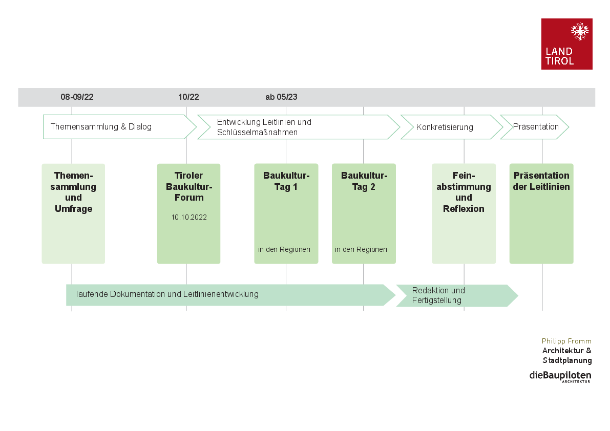 Das Land Tirol hat beschlossen in einem mehrstufigen Prozess, begleitet durch die ARGE Philipp Fromm & dieBaupiloten, baukulturelle Leitlinien für Tirol zu erstellen. Dieser Prozess dient dazu eine Bewusstseinsbildung für dieses Thema zu schaffen, den Blick für Baukultur zu schärfen, Bestehendes zu bewahren, zukunftsfähige Baukultur zu entwickeln und handelnde Akteure zu vernetzen.