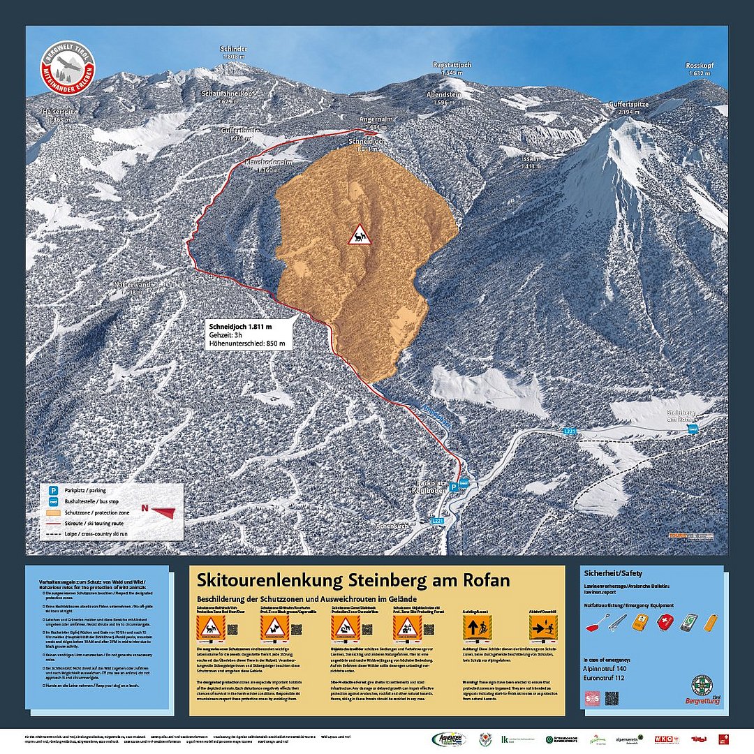 So informieren bereits an Einstiegen der Skitouren Panoramatafeln über geeignete Aufstiegswege und sensible Bereiche. Entlang der Strecke markieren Richtungsschilder und Wimpelleinen die Grenzen der Schutzzonen und schärfen das Bewusstsein für Tier- und Naturschutz. Ergänzend zu diesen analogen Hinweisen werden die Schutzbereiche auch in digitale Karten eingebunden und über gängige Online-Tourenportale kommuniziert, sodass eine vorausschauende und unkomplizierte Tourenplanung möglich ist.