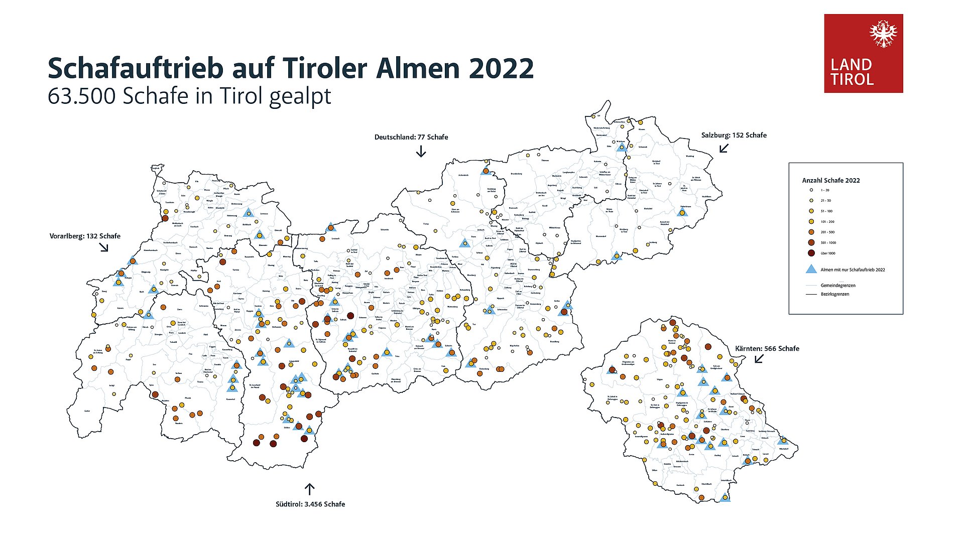 354 Schafe und Ziegen sowie ein beinahe ausgewachsenes Rind sind im vergangenen Jahr 2022 Wölfen zum Opfer gefallen, zahlreiche Weidetiere werden vermisst. Für einen Großteil der getöteten Schafe zeichneten fünf der 19 im vergangenen Jahr nachgewiesenen Wölfe verantwortlich. Alle Abschussbescheide gegen diese Wölfe wurden von Umweltorganisationen beeinsprucht. „Es wird auch im heurigen Almsommer Risse geben – und es wird auch kein wolfsfreies Tirol geben“, will LHStv Geisler keine falschen Erwartungen wecken, „aber wir haben jetzt eine taugliche Handhabe gegen Problemtiere“. Allein im ersten Quartal des heurigen Jahres wurden fünf verschiedene Wolfsindividuen in Tirol bestimmt.