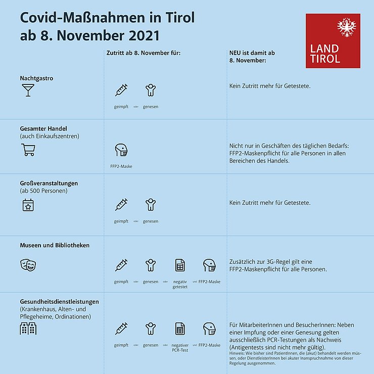 Als zwei wesentliche Bereiche verschärft das Land Tirol die Covid-Maßnahmen bei der Nachtgastronomie und bei Großveranstaltungen ab 500 Personen. Tirol sieht für diese beiden Bereiche ab 8. November eine 2G-Pflicht vor und zieht damit Stufe 2 des Bundes-Stufenplans vor. Das heißt, dass nur mehr Geimpfte oder Genesene die Nachtgastronomie und Großveranstaltungen besuchen dürfen. Für Getestete wird es künftig keine Möglichkeit mehr geben, diese beiden Bereiche zu nutzen.