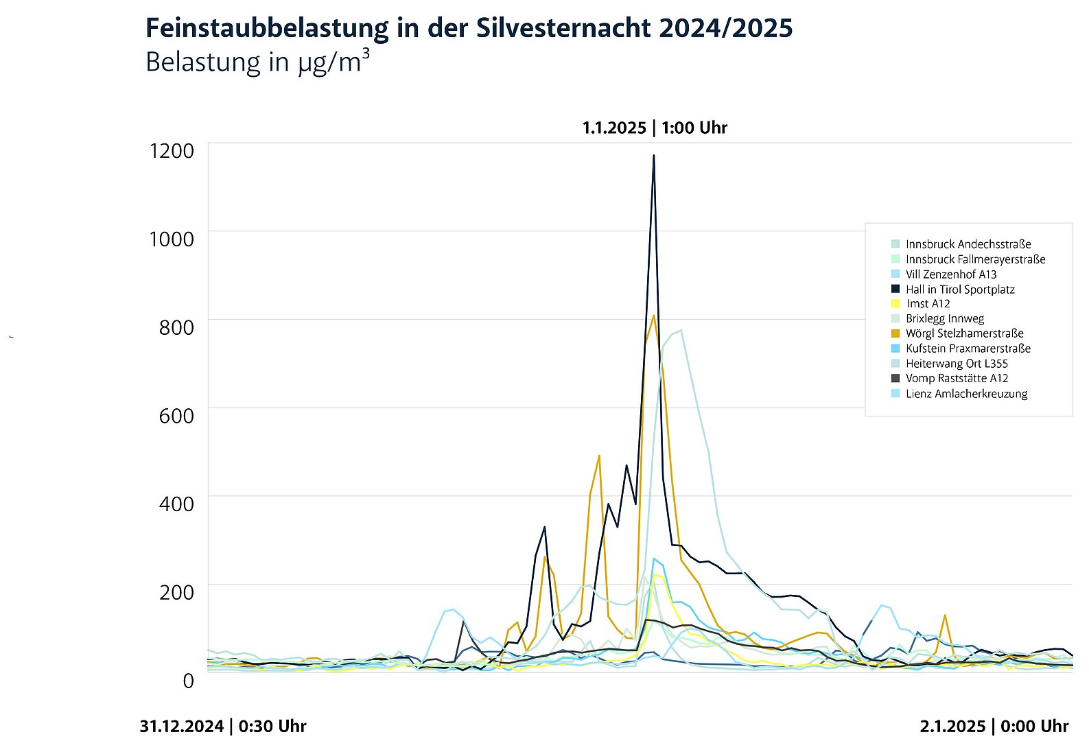 Im ganzen Land konnte man in der Silvesternacht wieder tausende Feuerwerke am Himmel sehen. Raketen und Böller lassen die Feinstaubbelastung jedes Jahr zum Jahreswechsel in die Höhe schnellen. An insgesamt elf Messstellen in Tirol wird die Luftgütewerte im Hinblick auf Feinstaub ständig überwacht. Während die Luft in den vergangenen Jahren verhältnismäßig wenig belastet war, wurde der im Immissionsschutzgesetz-Luft festgelegte Grenzwert von 50 µg pro Kubikmeter im Tagesmittel heuer an mehreren Messstellen deutlich überschritten. Laut den ExpertInnen der Abteilung Waldschutz des Landes Tirol war dafür unter anderem auch die Hochdruckwetterlage mit windschwachen Verhältnissen und Temperaturinversionen ausschlaggebend. Der höchste Feinstaubmesswert am 1. Jänner 2025 im Tagesmittel wurde an der Messstelle in der Innsbrucker Andechsstraße mit 172 µg pro Kubikmeter gemessen. Ebenfalls sehr hohe Werte wurden in Hall in Tirol festgestellt. „Die gemessene Feinstaubbelastung rund um den Jahreswechsel zeigt, wie sehr die Feuerwerke in nur einer einzigen Nacht unsere Luft negativ beeinträchtigen. In den letzten Jahren hat uns das Wetter vor größeren Überschreitungen der Grenzwerte bewahrt, dieses Jahr sieht die Bilanz leider ganz anders aus. Die Feuerwerke belasten letztlich nicht nur die Luft, sondern verschmutzen auch langfristig Böden und Gewässer“, resümiert Naturschutzlandesrat René Zumtobel.