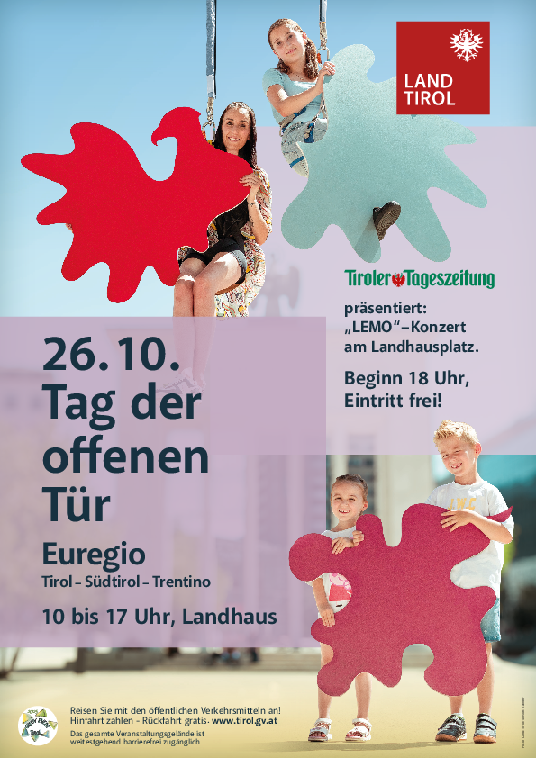 Zahlreiche TirolerInnen besuchen jedes Jahr am 26. Oktober den „Tag der offenen Tür“ im Innsbrucker Landhaus – und auch heuer öffnen sich wieder die Türen: Die Tiroler Landesregierung sowie der Tiroler Landtag können besucht werden und für die ganze Familie wird wieder ein buntes Programm auf die Beine gestellt – von Ständen und Mitmach-Aktionen der Landesabteilungen über Leistungsschauen von Tiroler Einsatzorganisationen bis hin zur Gesundheitsstraße, dem Europacafé oder einem Kinderschminken. Der Tag der offenen Tür steht heuer ganz im Zeichen der Europaregion Tirol-Südtirol-Trentino, in welcher Tirol im Herbst die zweijährige Präsidentschaft übernimmt. Aber auch der Tirol-Konvent, der Weiterentwicklungsprozess der Landesverwaltung, prägt das heurige Programm: Das Land Tirol präsentiert seine Dienstleistungen und Services, berät die Bevölkerung direkt vor Ort und gibt Einblicke, wie die Verwaltung noch besser werden kann. Die aktuelle Ausstellung im Landhaus zu Leokadia Justman „Brechen wir aus!“ kann ebenfalls besucht werden. Das musikalische Highlight am Abend: das Konzert am Landhausplatz. Ab 18 Uhr tritt der österreichische Musiker LEMO auf – präsentiert von der Tiroler Tageszeitung.