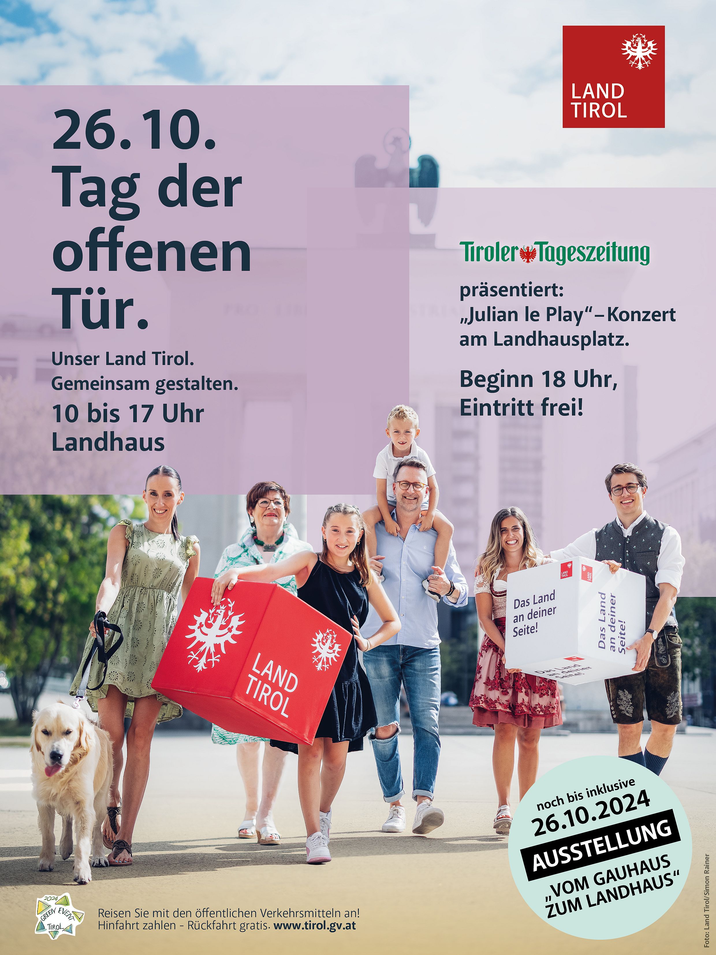 In wenigen Tagen ist es soweit: Am 26. Oktober 2024 öffnet das Landhaus von 10 bis 17 Uhr seine Türen. Neben dem bunten Rahmenprogramm für Klein und Groß – samt Informationsangeboten bei den Abteilungen des Landes und Tiroler Einsatzorganisationen, Besuchsmöglichkeiten bei der Tiroler Landesregierung und dem Tiroler Landtag, einem eigenen Kinderprogramm oder Vorführungen der Spezialeinheit Cobra – bieten heuer zahlreiche Mitmachaktionen und Umfragen den BesucherInnen die Möglichkeit, aktiv an der Weiterentwicklung der Tiroler Landesverwaltung mitzuwirken. Während es tagsüber unter anderem ums Mitmachen, Mitreden und Mitwirken geht, heißt es am Abend vor allem Mitsingen: Popstar Julian le Play sorgt am Landhausplatz ab 18 Uhr für musikalische Unterhaltung. Präsentiert wird das kostenfrei zugängliche Konzert von der Tiroler Tageszeitung.