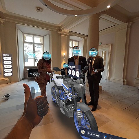 Gruppenfoto; Mair und Gerber halten große Tafeln mit Mockups der App