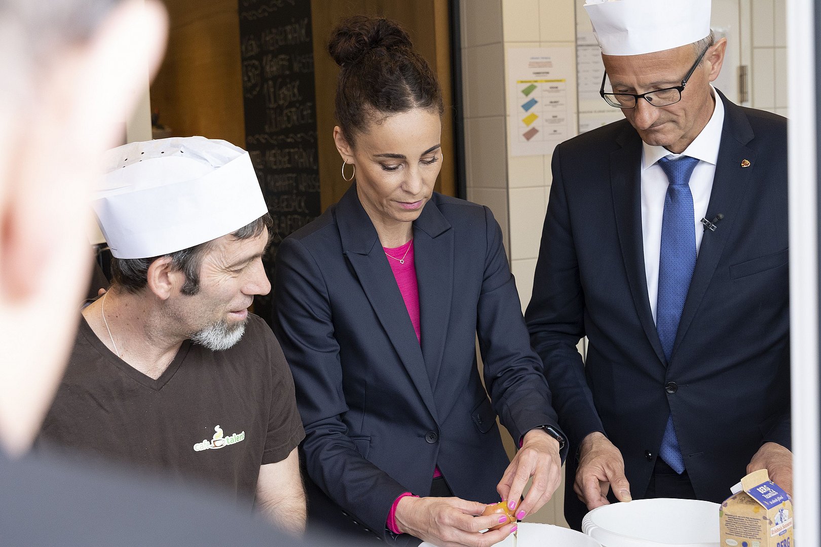 Verschiedene Einrichtungen kennenlernen und die Freiwilligentätigkeit „ausprobieren“ – das können Interessierte an den Freiwilligentagen. Sie finden von heute, Montag, bis Mittwoch, den 26. April statt. Zur Auswahl stehen dabei tirolweit mehr als 100 Projekte. LH Anton Mattle und Soziallandesrätin Eva Pawlata besuchten zum Auftakt der Freiwilligentage das inklusive „cafetalent“ der Lebenshilfe in Vomp. Dort arbeiten – mit der Unterstützung von AssistentInnen – Menschen mit Behinderungen aus der Region Schwaz. Die Freiwilligentage nimmt der Arbeitsstandort zum Anlass, um künftig auch Freiwillige für die Arbeit im inklusiven Café zu gewinnen. Gemeinsam mit weiteren TeilnehmerInnen sowie den KlientInnen im „cafetalent“ bereiteten LH Mattle und LRin Pawlata bei der Aktion im Rahmen der Freiwilligentage Süßspeisen und Getränke zu.