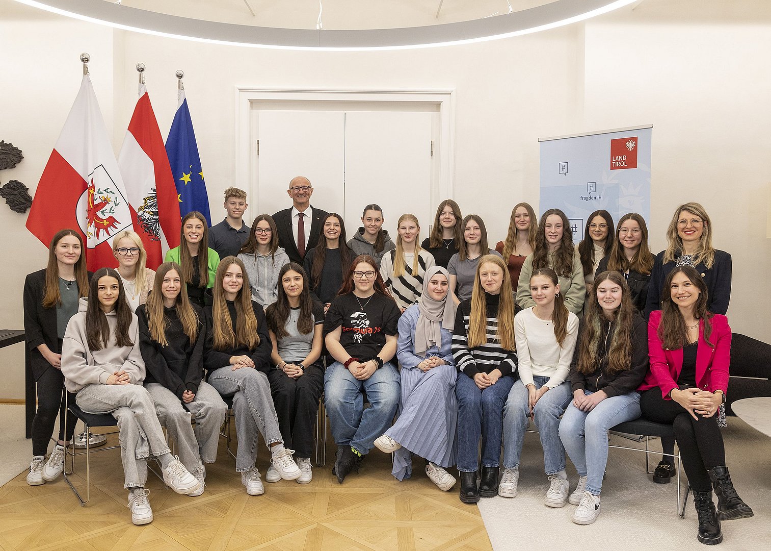 Zum zweiten Mal im heurigen Jahr empfing LH Anton Mattle SchülerInnen im Rahmen von „Frag den LH“. Diesmal war die erste Klasse der Höheren Lehranstalt für Pflege und Sozialbetreuung (HLPS) Innsbruck im Büro des Landeshauptmannes im Innsbrucker Landhaus zu Gast. „Für mich ist ‚Frag den LH‘ ein regelmäßiger Termin, auf den ich mich freue, um mich mit jungen Tirolerinnen und Tirolern auszutauschen. Als Landeshauptmann ist es wichtig, sich mit den Interessen, Sorgen und Wünschen der jungen Generation auseinanderzusetzen. Dieses Mal war es ein spannender Einblick in die Pflegeausbildung“, erklärt LH Mattle.