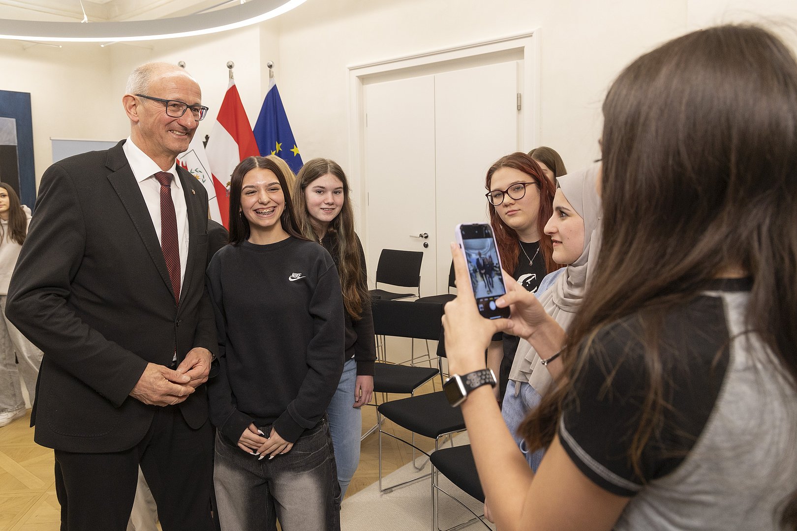 Die SchülerInnen nutzen selbst täglich Social Media und wollten deshalb wissen, wie der Landeshauptmann mit sozialen Medien umgeht. „Ich hatte schon früh einen Facebook-Account, den ich selbst betrieben habe. Mit der Zeit wollte ich auch jüngere Generationen erreichen und stieg auf Instagram ein. Als Landeshauptmann habe ich nun das große Glück, dass sich mein Team um den gesamten Bereich der sozialen Medien kümmert. Mittlerweile informiere ich auf Facebook, Instagram, LinkedIn, TikTok und auch BeReal über meine Arbeit. Mir ist es wichtig, auf vielen Kanälen präsent zu sein, um insbesondere junge Menschen zu erreichen“, so LH Mattle.