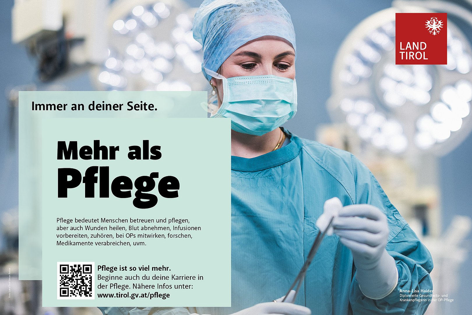 Die MitarbeiterInnen in der Pflege und im Gesundheitsbereich sind die stillen Heldinnen und Helden des Alltags. Sie begleiten die Menschen durch alle Lebensphasen – von der Geburt bis zum Lebensende. Oft sind sie den Menschen so nah wie die eigene Familie und agieren dabei stets hochprofessionell. Ihr Einsatz ist weit mehr als ein Beruf, es ist eine Berufung. Mit der neuen Kampagne des Landes unter dem Titel „Immer an deiner Seite“ setzt das Land Tirol ein starkes Zeichen für die Bedeutung dieser Berufe – sowohl für die Gesellschaft als auch für jede und jeden Einzelnen. Die Initiative hat das Ziel, junge Menschen und QuereinsteigerInnen für eine Karriere in der Pflege zu begeistern und zugleich die öffentliche Wertschätzung für Pflege- und Gesundheitsberufe zu stärken. Außerdem wird aufgezeigt, wie vielfältig die Pflege und die Arbeit im Gesundheitsbereich ist, wie viel Freude diese Tätigkeit machen kann und wie sinnstiftend sie sein kann. Die Kampagne, für die das Land Tirol bis 2025 bis zu 250.000 Euro zur Verfügung stellt, wird in Printmedien, online und auf Social Media zu sehen sein.