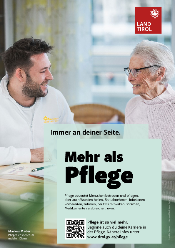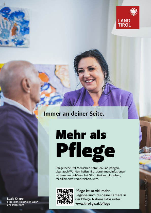 Mit der Kampagne „Immer an deiner Seite“ lenkt das Land Tirol seit vier Monaten die Aufmerksamkeit auf die Professionalität und das vielseitige Aufgabengebiet in der Pflege. Authentische Einblicke und persönliche Geschichten zeigen die Vielfalt des Arbeitsalltags, Karrieremöglichkeiten sowie die gesellschaftliche Bedeutung dieses Berufsfelds auf. „Pflegeberufe begeistern: Wir möchten genau das zeigen und deutlich machen, dass Pflege viele Perspektiven bietet – für junge Menschen genauso wie für all jene, die erst später diesen Beruf für sich entdecken“, betont LRin Hagele. Die Kampagne wird von der Abteilung Öffentlichkeitsarbeit des Landes umgesetzt und begleitet.