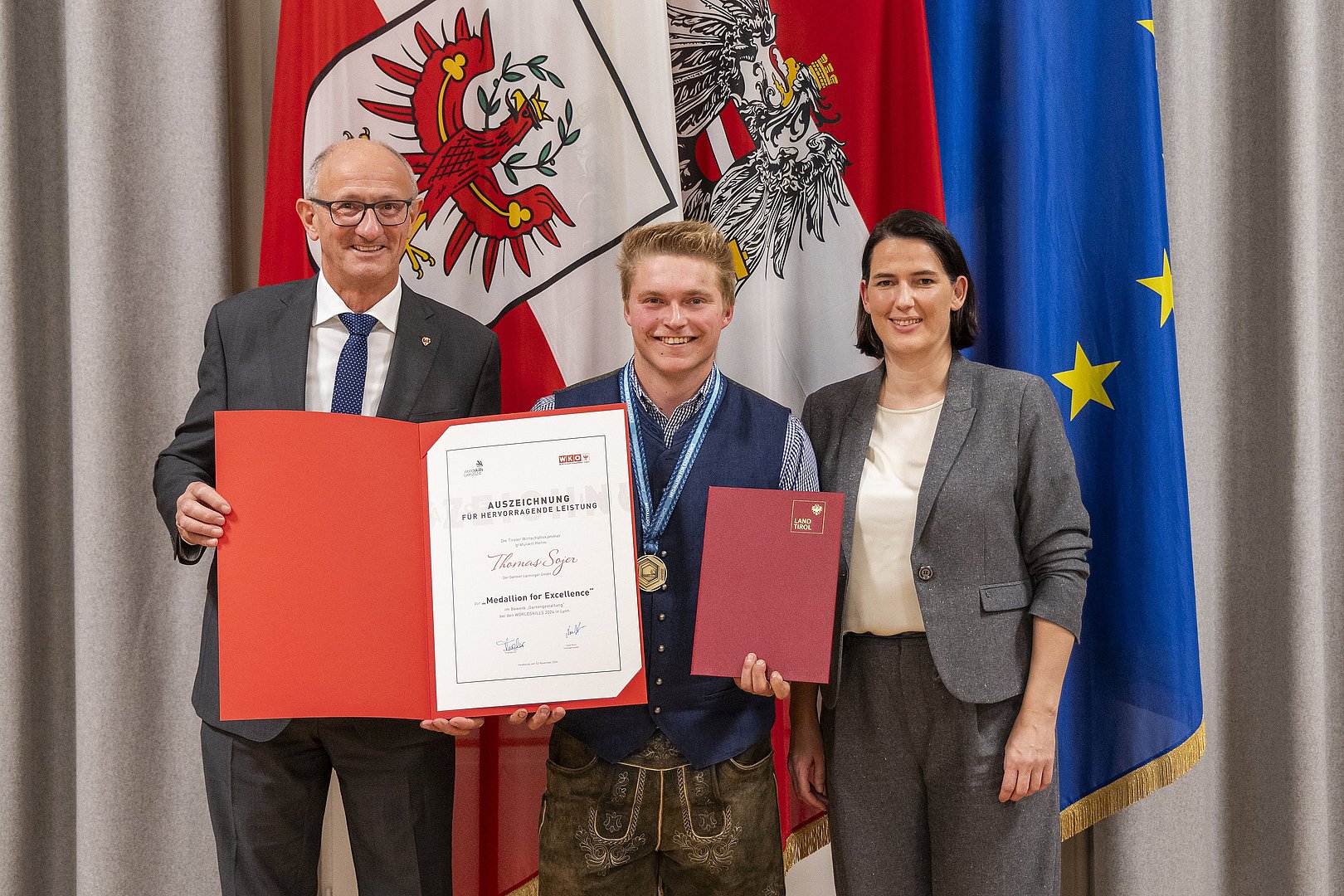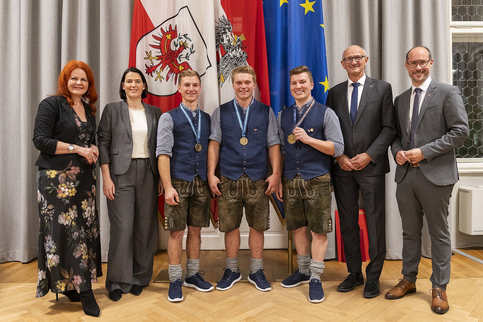 Vor wenigen Wochen gingen die Berufsweltmeisterschaften WorldSkills 2024 in Lyon (Frankreich) über die Bühne – mit erfolgreicher Tiroler Beteiligung: Stefan Moser aus der Wildschönau sicherte sich im Bereich Chemielabortechnik die Bronzemedaille. Zudem erhielten Benedikt Laiminger aus Itter und Thomas Sojer aus Söll im Teambewerb Gartengestaltung das „Medallion for Excellence“ für ihre hervorragenden Leistungen. Gestern, Mittwochabend, empfingen LH Anton Mattle und Tirols WK-Präsidentin Barbara Thaler die Tiroler Teilnehmer im Innsbrucker Landhaus, wo sie für ihre Leistungen geehrt wurden.