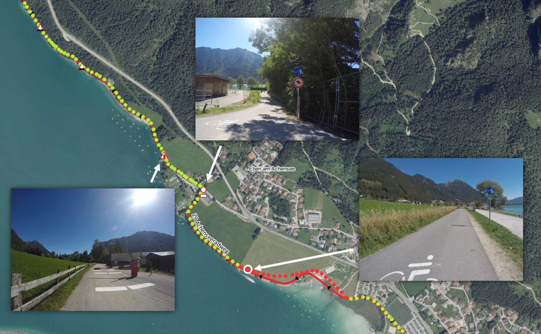 Die Rohdaten wurden mittels der GIS Software QGIS zu einem dynamischen Datensatz zusammengefügt (siehe folgende Abbildung). Die in hellgrün dargestellten Punkte repräsentieren die kontinuierlich erfassten Aufnahmen. Dank der verspeicherten Positionsdaten können die Fotos gezielt nach ihrem räumlichen Bezug ausgewählt und angezeigt werden. Dies ermöglicht einen schnellen und praktikablen Zugriff auf die erhobenen Informationen. Abweichungen vom Routenverlauf, die während der Befahrung auftraten, sind durch rote Punkte markiert. Diese wurden in der Nachbearbeitung detektiert und analysiert und bilden nun eine wichtige Informationsgrundlage, z.B. zur Verbesserung der Beschilderung oder Korrektur der Routenverläufe in der GIP. Gefahrenstellen und Fahrverbote sind jeweils mit Sondersymbolen versehen.