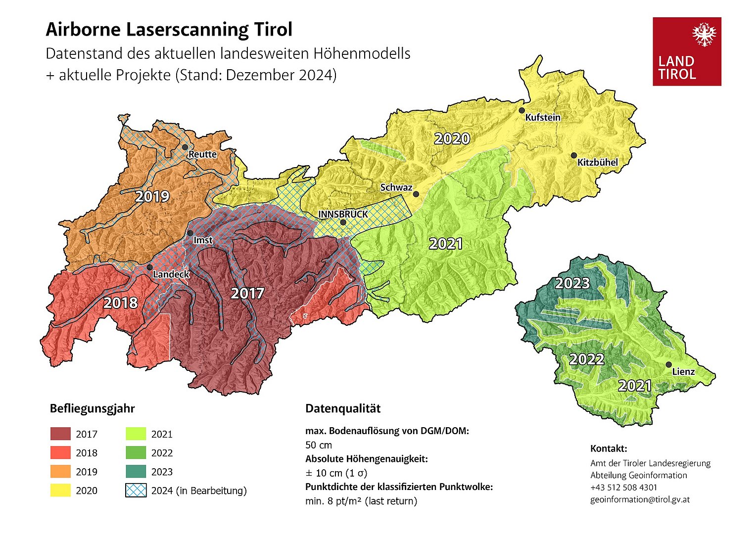 Zwischen 2017 und 2023 wurde die Landesfläche von Tirol zum zweiten Mal flächendeckend mittels Airborne Laserscanning erfasst. Die Bodenpunktdichte der klassifizierten Punktwolke beträgt mindestens 8 Punkte / m².