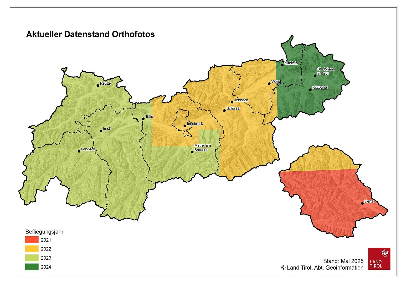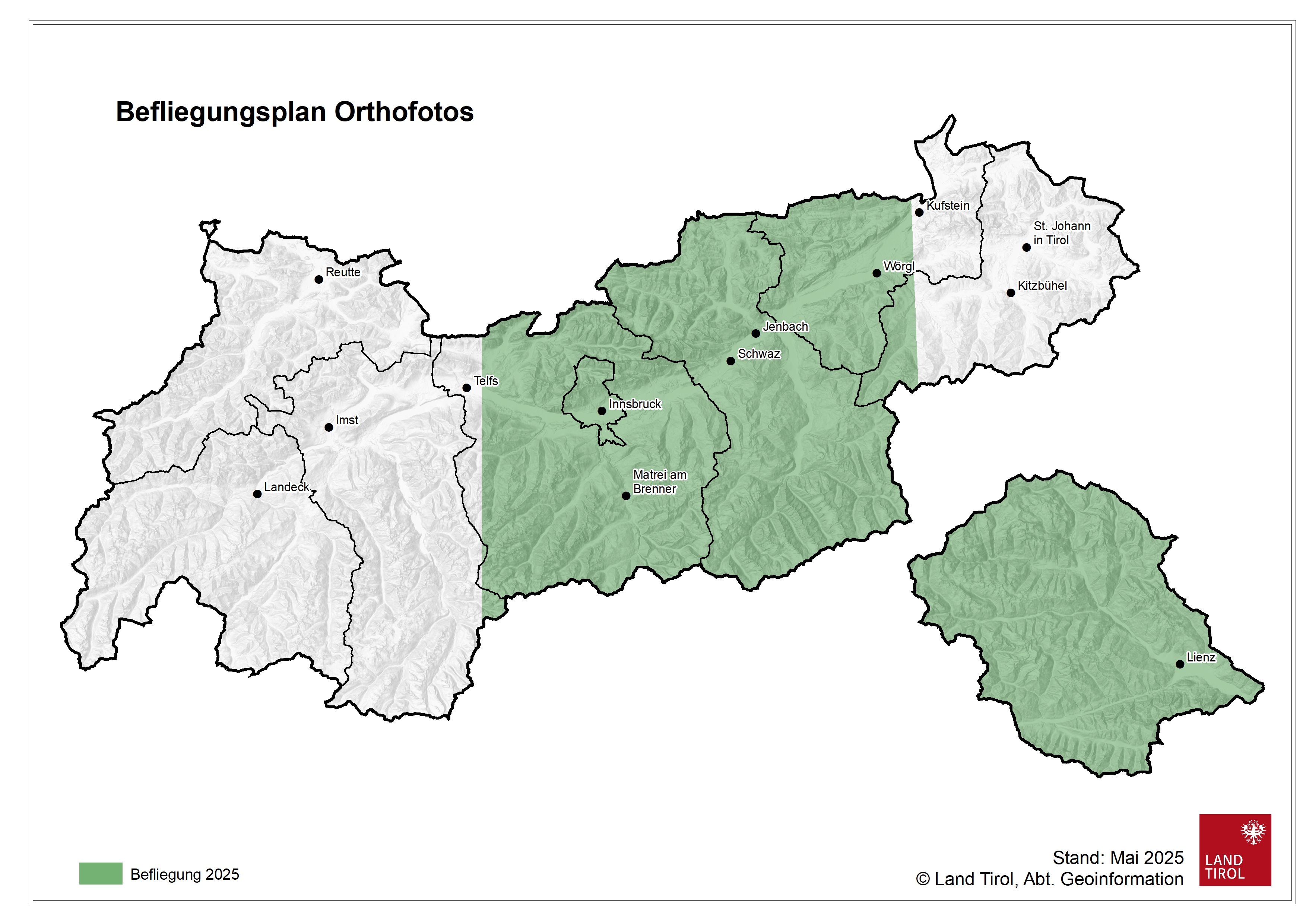 Die aktuellen Orthofotos von Tirol basieren auf digitalen Luftbildern und sind in einer Auflösung von 20 cm verfügbar.