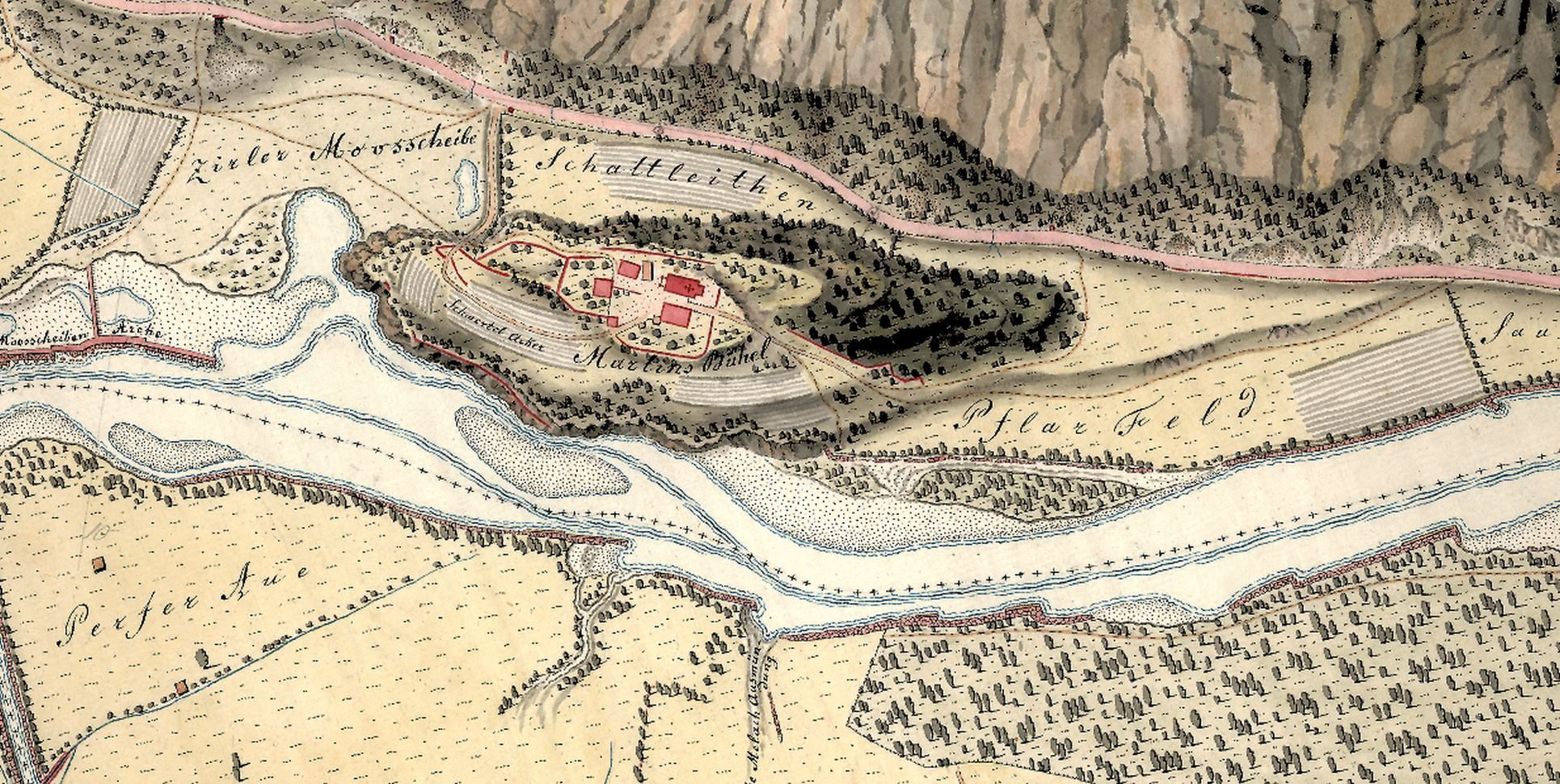 Verschiedene alte Darstellungen wie z. B. die historische Innstromkarte, 1800-1828, sind in der Webanwendung Historische Kartenwerke Tirol ersichtlich.
