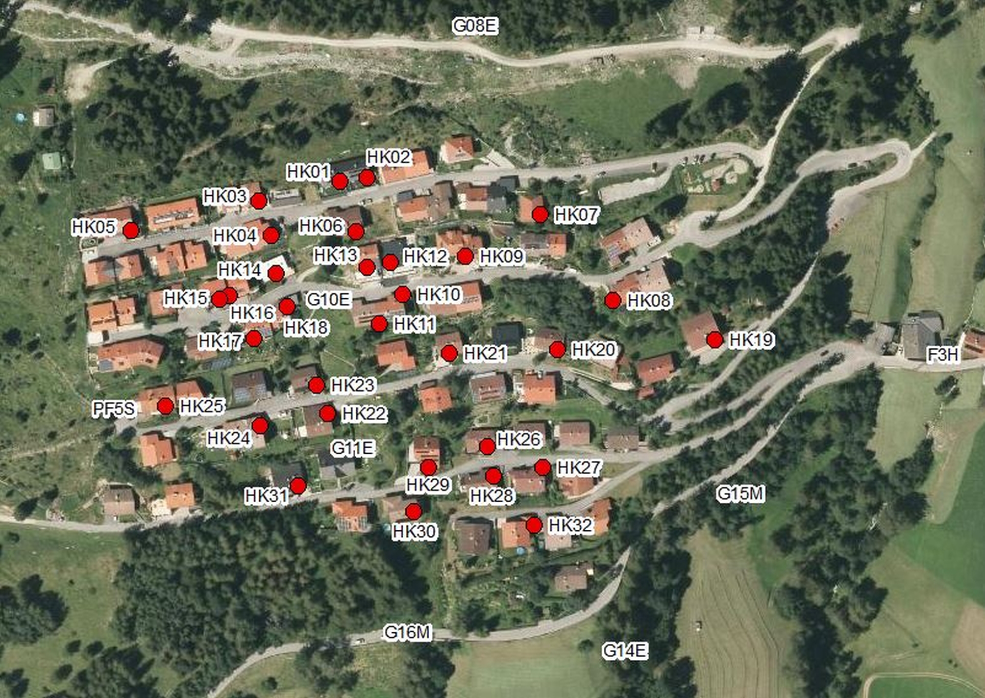 Das Geomonitoring „Kerschbaumsiedlung“ ist seit August 2013 in Betrieb. Es werden rund 80 Punkte (Reflektorspiegel) im Gelände und an Objekten stündlich beobachtet. Die Ergebnisse werden in Form von Wochenberichten an das Expertenteam der Landesgeologie und der Wildbach- und Lawinenverbauung weitergegeben. Die aktuellen Bewegungen finden Sie hier (verwenden Sie als Browser den Mozilla Firefox).