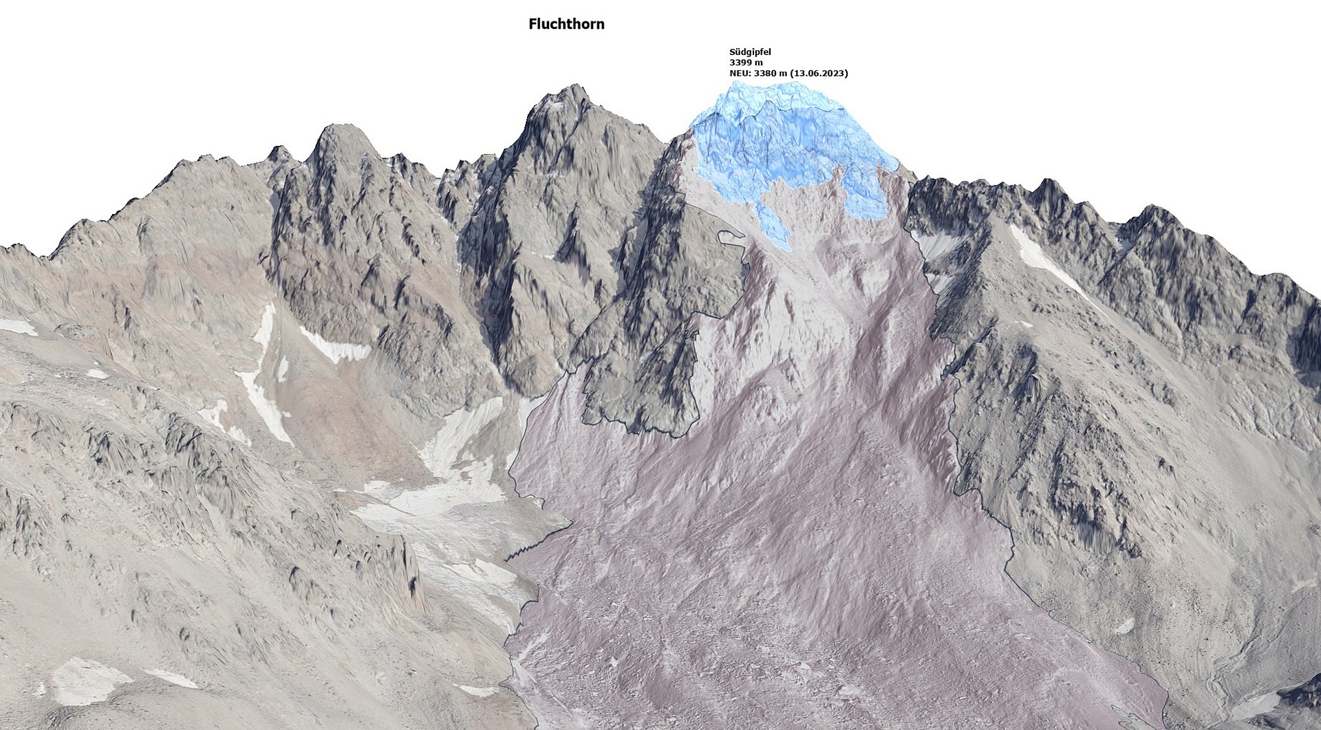 Das Gipfelprofil lässt erkennen, dass der neue Südgipfel des Fluchthorns um 19 Meter niedriger ist als noch vor dem Felssturz.© Land Tirol