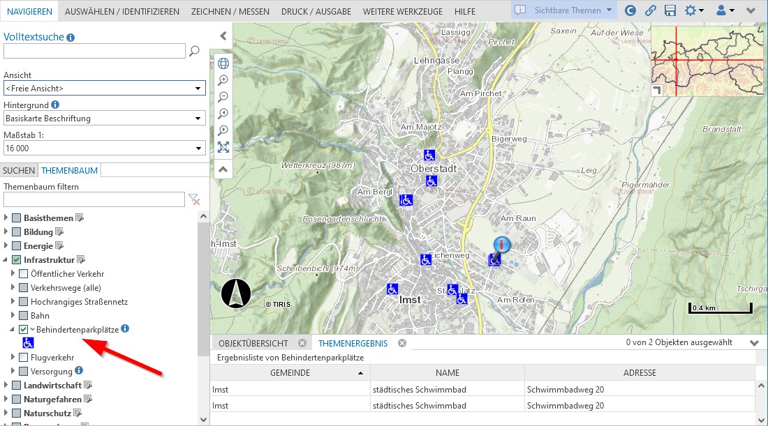 Alle Behindertenparkplätze auf öffentlichen Flächen in den Bezirkshauptstädten sind ab sofort im Rauminformationssystem des Landes abrufbar. © Land Tirol/tiris