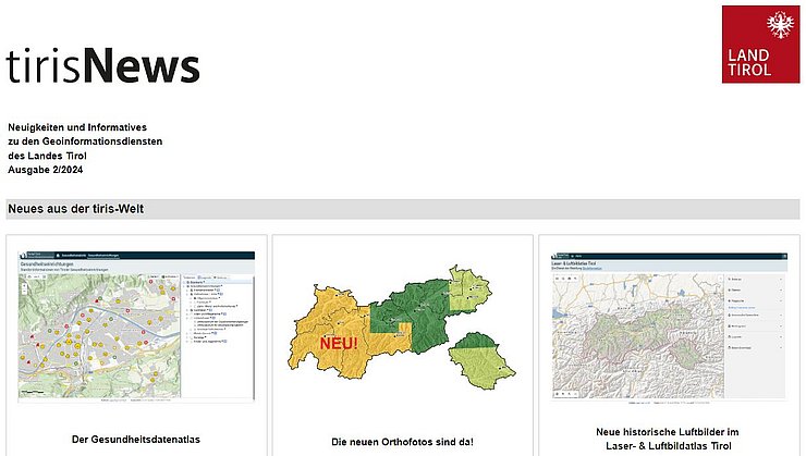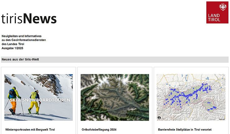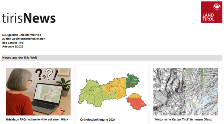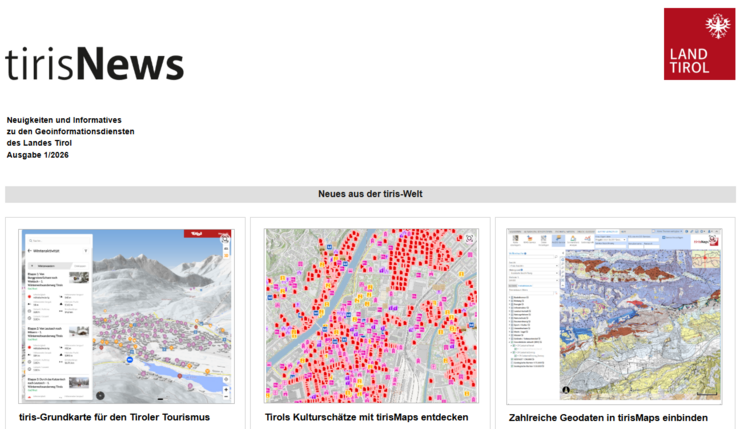 Diese Ausgabe stellt die tiris-Homepage vor, gibt einen Überblick über die frei verfügbaren tiris-Geodaten auf data.gv.at und präsentiert die Webanwendung der Historischen Karten Tirols. Das erste Video einer ganzen Serie von Anleitungsvideos befasst sich mit der Grundstücks- und Einlagezahlsuche im tirisMaps. Abschließend wird das Örtliche Einsatzinformationssystem tirisOEI vorgestellt.
