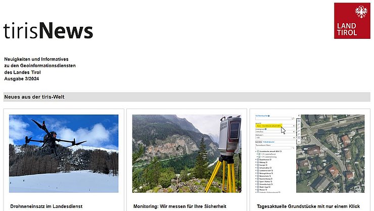 In der dritten Ausgabe informieren wir über den Einsatz von Drohnen beispielsweise bei Naturkatastrophen, Schadenserhebungen oder Sucheinsätzen. Im Fokus stehen außerdem die Überwachung von Felsstürzen und Rutschungen sowie die neue Ansicht in tirisMaps zum tagesaktuellen Grundstücks-Kataster des BEV. Weiters werden das Wasserinformationssystem Tirol und ein neues Anleitungsvideo zu tirisMaps vorgestellt.