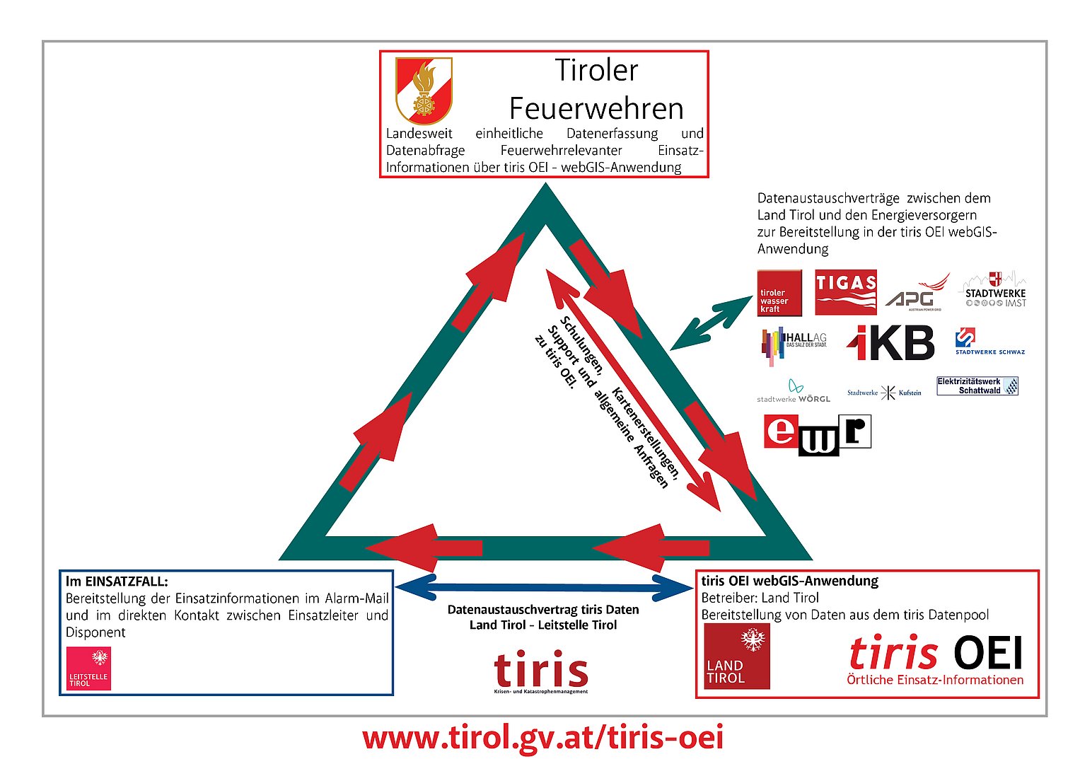 Ein gut durchdachter Datenkreislauf zwischen den örtlichen Feuerwehren, dem tiris Krisen- und Katastrophenmanagement und der Leitstelle Tirol gewährleistet beste Information der Einsatzkräfte im Einsatzfall.
