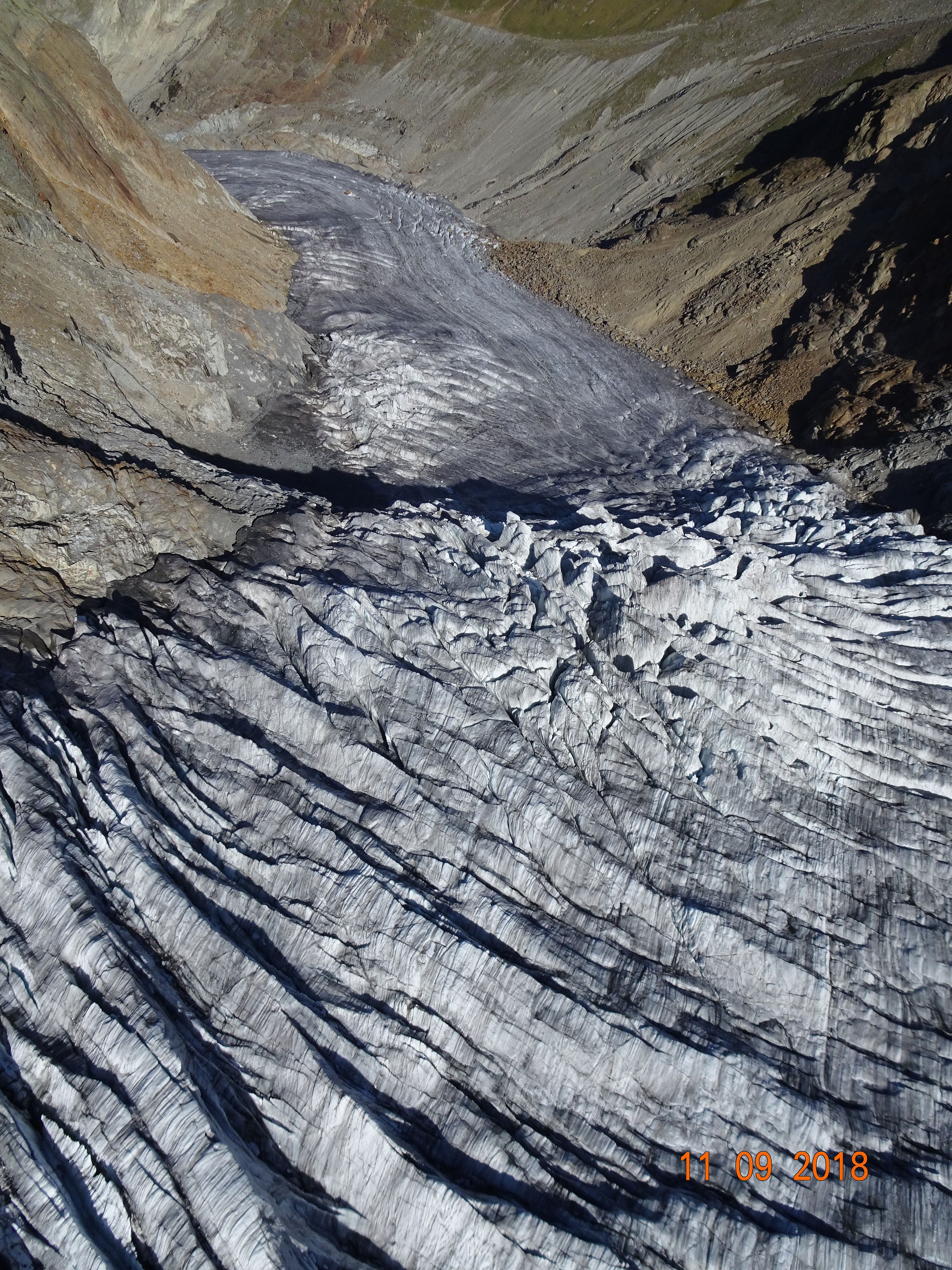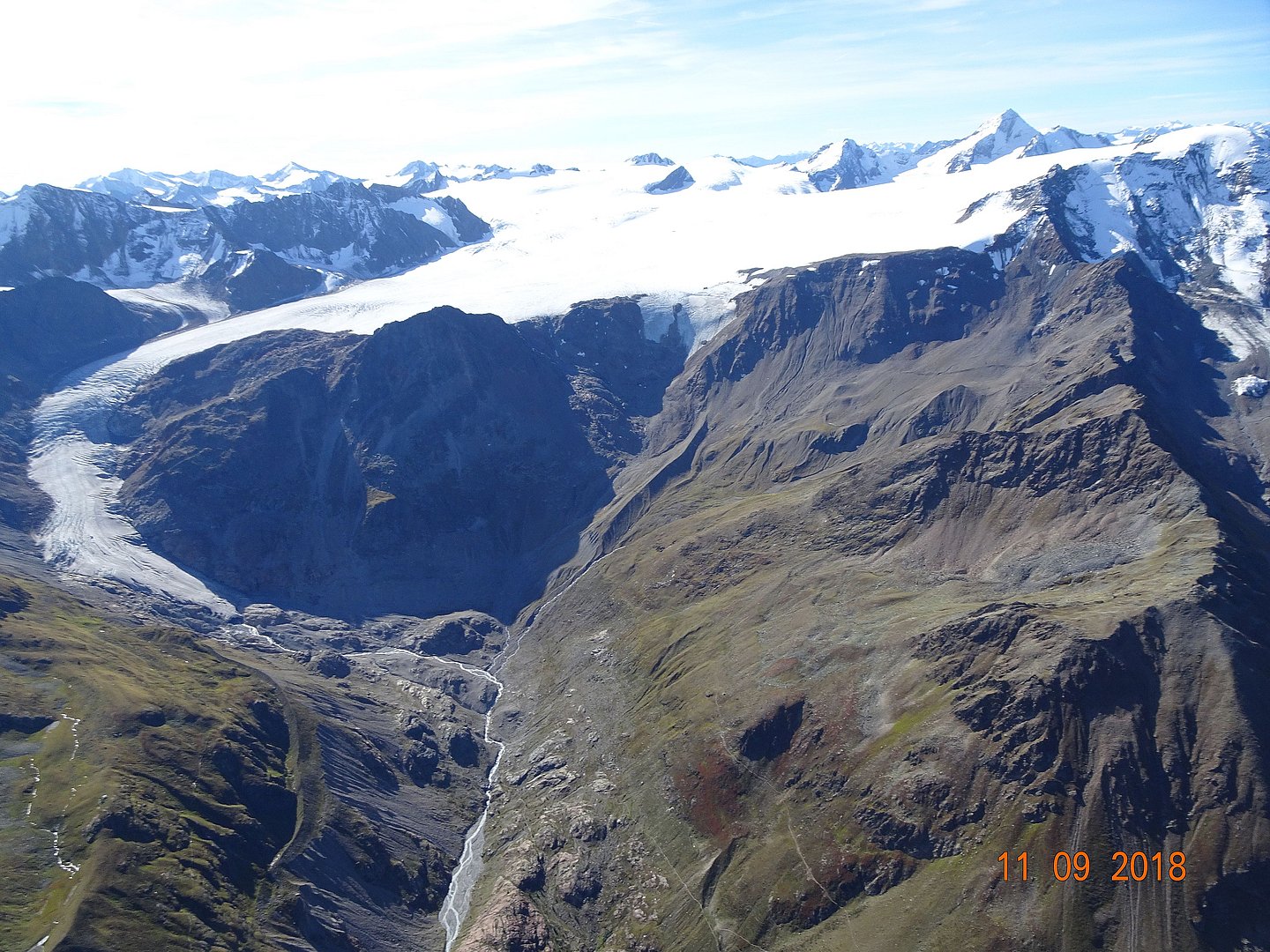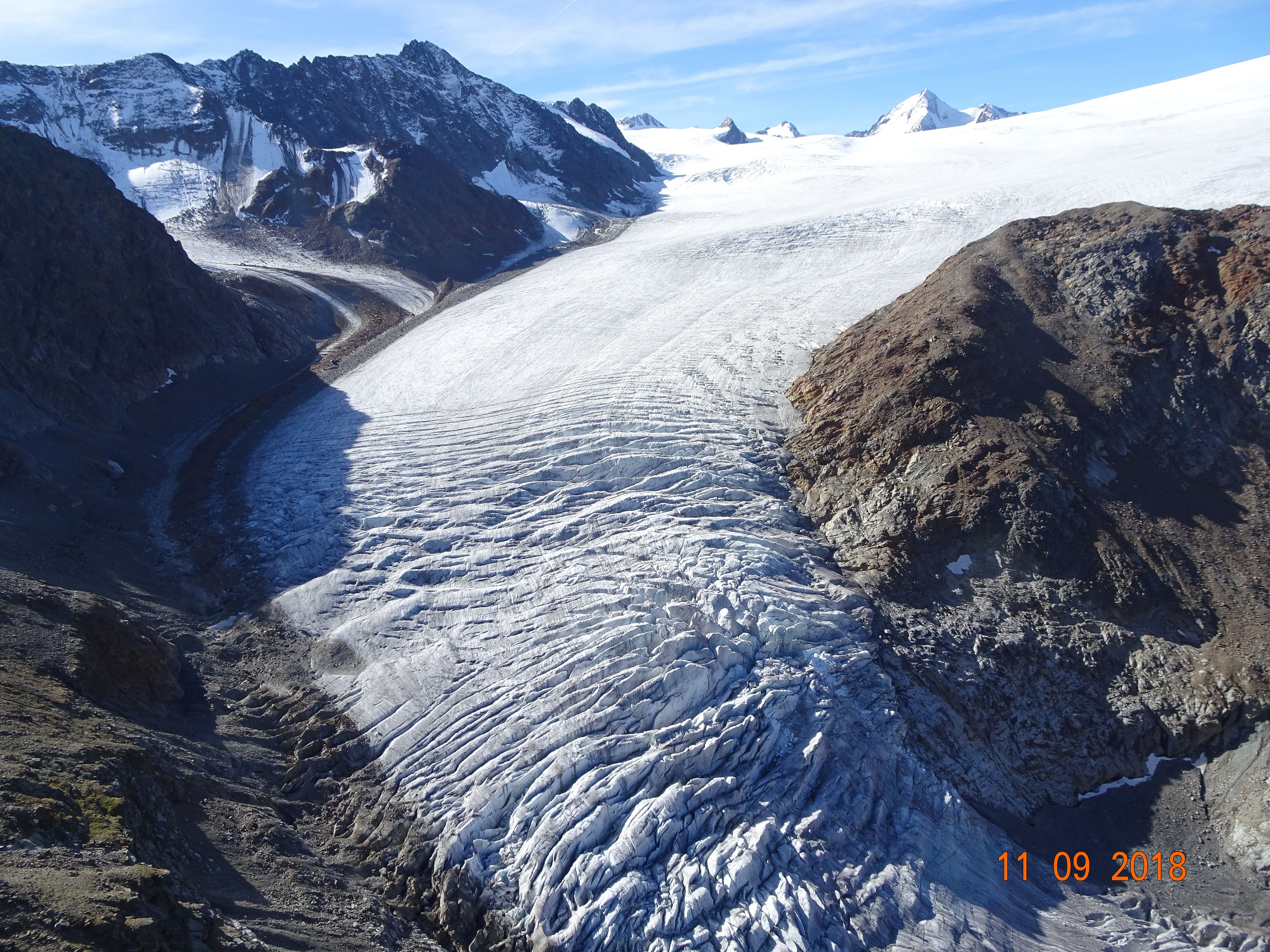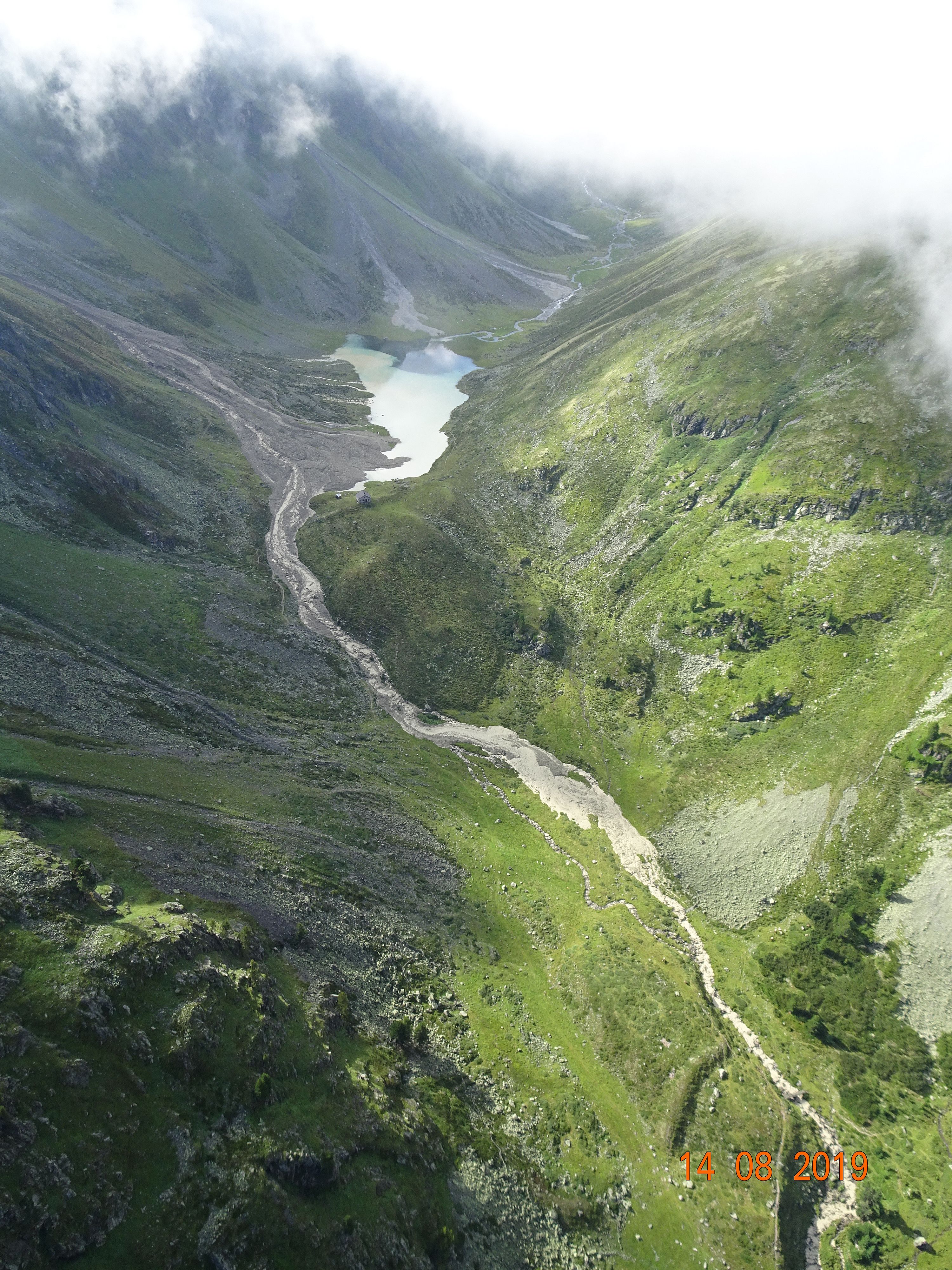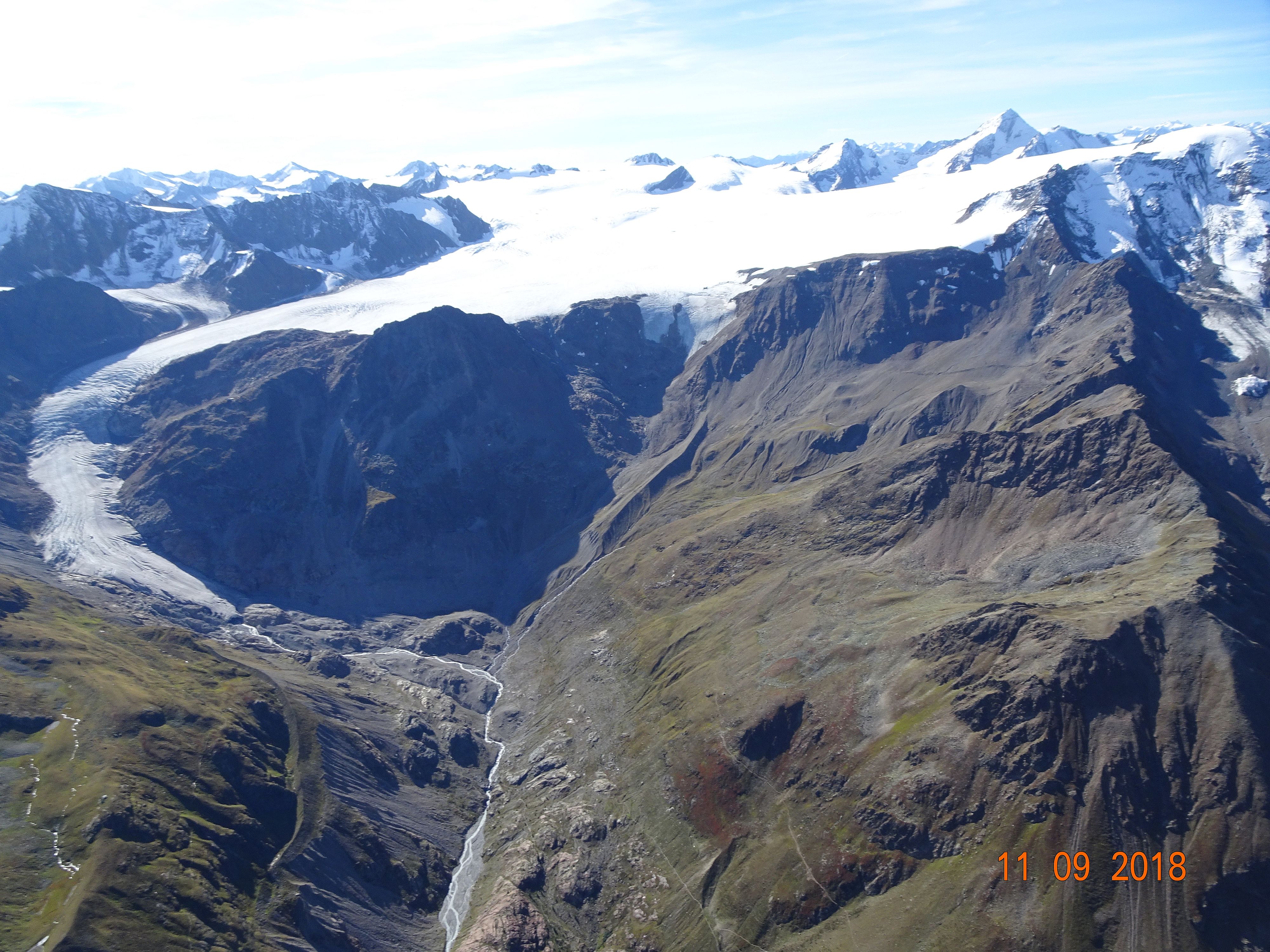 Am 14.08.2019 wurde ein Erkundungsflug der Landesgeologie im Bereich des Glockturms im Radurschltal der Gemeinde Pfunds durchgeführt. Am Fuße des Glockturmferners entstand heuer in einer neu entstandenen Senke auf dem dortigen Blockgletscher erstmals ein See. Es ist davon auszugehen, dass dieser plötzlich ausgebrochen ist und innerhalb des blockigen Materials auf dem Blockgletschereises bis zur Blockgletscherstirn geflossen ist.