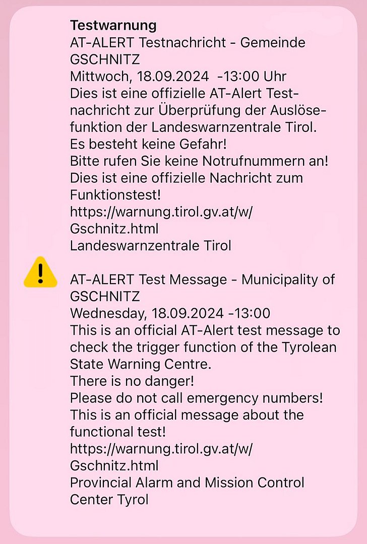 Warnungen im Ernstfall für alle Betroffenen direkt auf das Mobiltelefon – ohne App oder Anmeldung: Mit dem neuen Cell Broadcast-System „AT-Alert“ ist das künftig in ganz Österreich möglich. Um das System vor Inbetriebnahme genauestens zu überprüfen, finden aktuell auch in Tirol Tests in ausgewählten Gemeinden statt. Heute, Mittwoch, wurden die ersten Tiroler Tests in den Gemeinden Gschnitz (Bezirk Innsbruck-Land), Gramais und Jungholz (jeweils Bezirk Reutte) erfolgreich durchgeführt. Die Testwarnungen wurden als Test- bzw. Übungswarnung ausgesandt, daher konnten sie nur von jenen MobiltelefonnutzerInnen empfangen werden, welche den Empfang solcher Test- bzw. Übungswarnungen in ihrem Gerät aktiviert haben. Weitere Tests sind für kommende Woche, Donnerstag, 26. September, in der Stadt Innsbruck und Prägraten am Großvenediger (Bezirk Lienz) bzw. am Zivilschutztag, dem 5. Oktober, geplant.