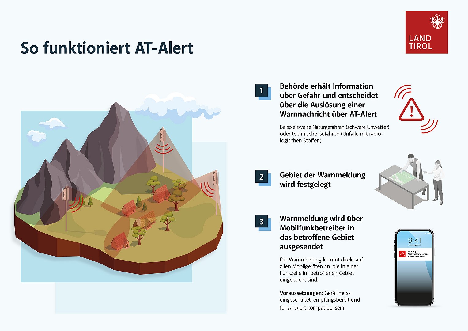 Mit AT-Alert erhalten Betroffene im Ernstfall eine Warnung direkt auf das Mobiltelefon – ohne App oder Anmeldung. Der große Vorteil des Systems: Egal ob Einheimische, Gäste oder Durchreisende – alle Mobiltelefone, die im Gefahrengebiet in eine Funkzelle eingebucht sind, erhalten die Warnnachricht. Zusätzlich werden über AT-Alert bereits Handlungsempfehlungen für Betroffene übermittelt.